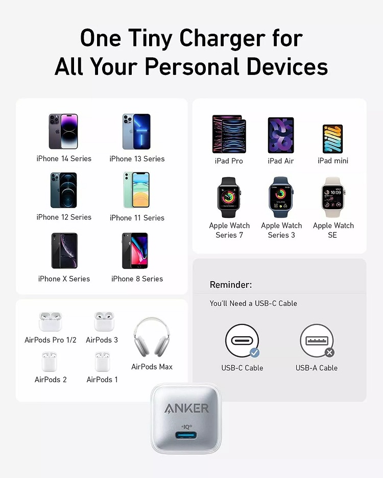 Anker Network Charger 20W, 512 Nano, is small and compact, compatible with smartphones, tablets and other USB-C devices. It offers 20W fast charging for the latest iPhone models. With a power of 20W, USB-C charging allows charging the iPhone up to 50% in just 25 minutes,