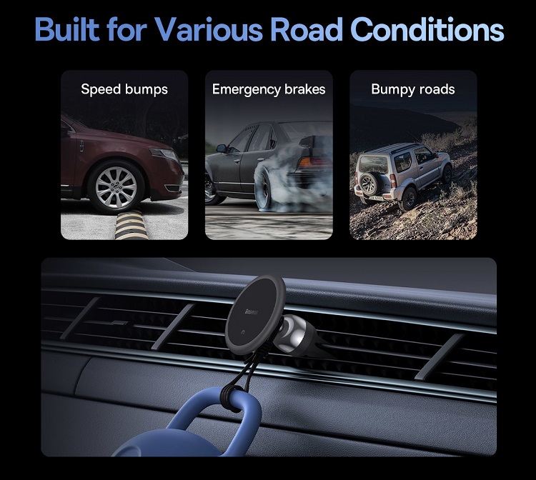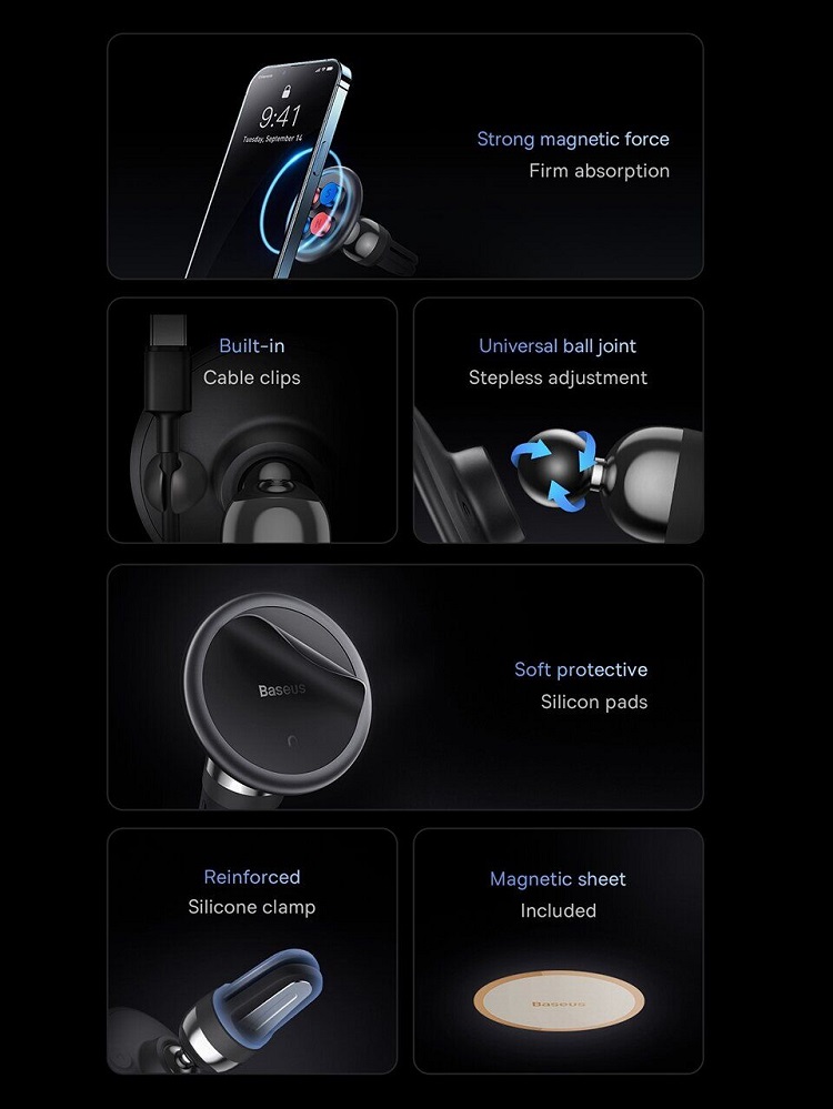 The Baseus magnetic car holder allows you to operate your phone with one hand, and the silicone clip guarantees a stable position of the holder even on a bumpy road, while the 360° adjustable design allows you to position the phone exactly as you want .