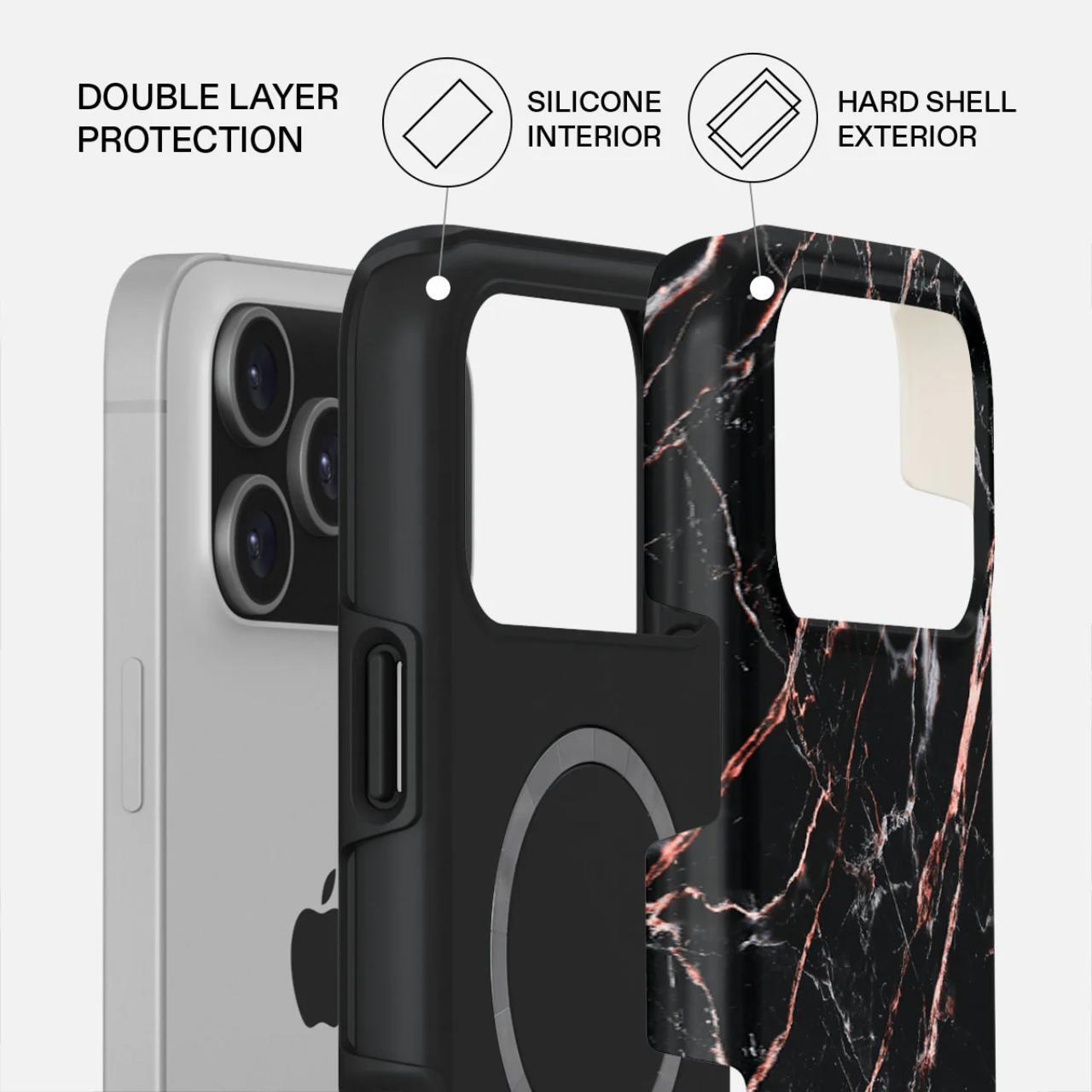 Dual Layer Magsafe Rose Gold Marble Case for iPhone 17 Pro Max from Burga, has a unique and colorful pattern, and the silicone interior will protect the device during falls while the 2 mm raised bezels offer screen and camera protection.