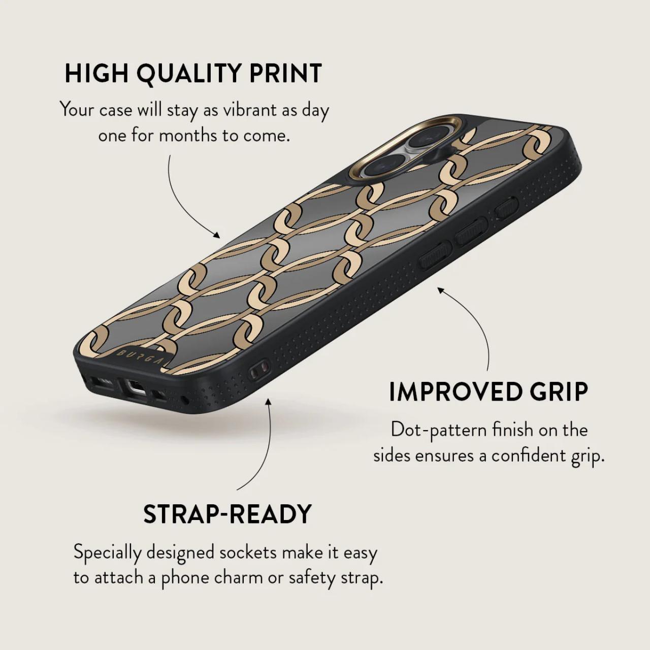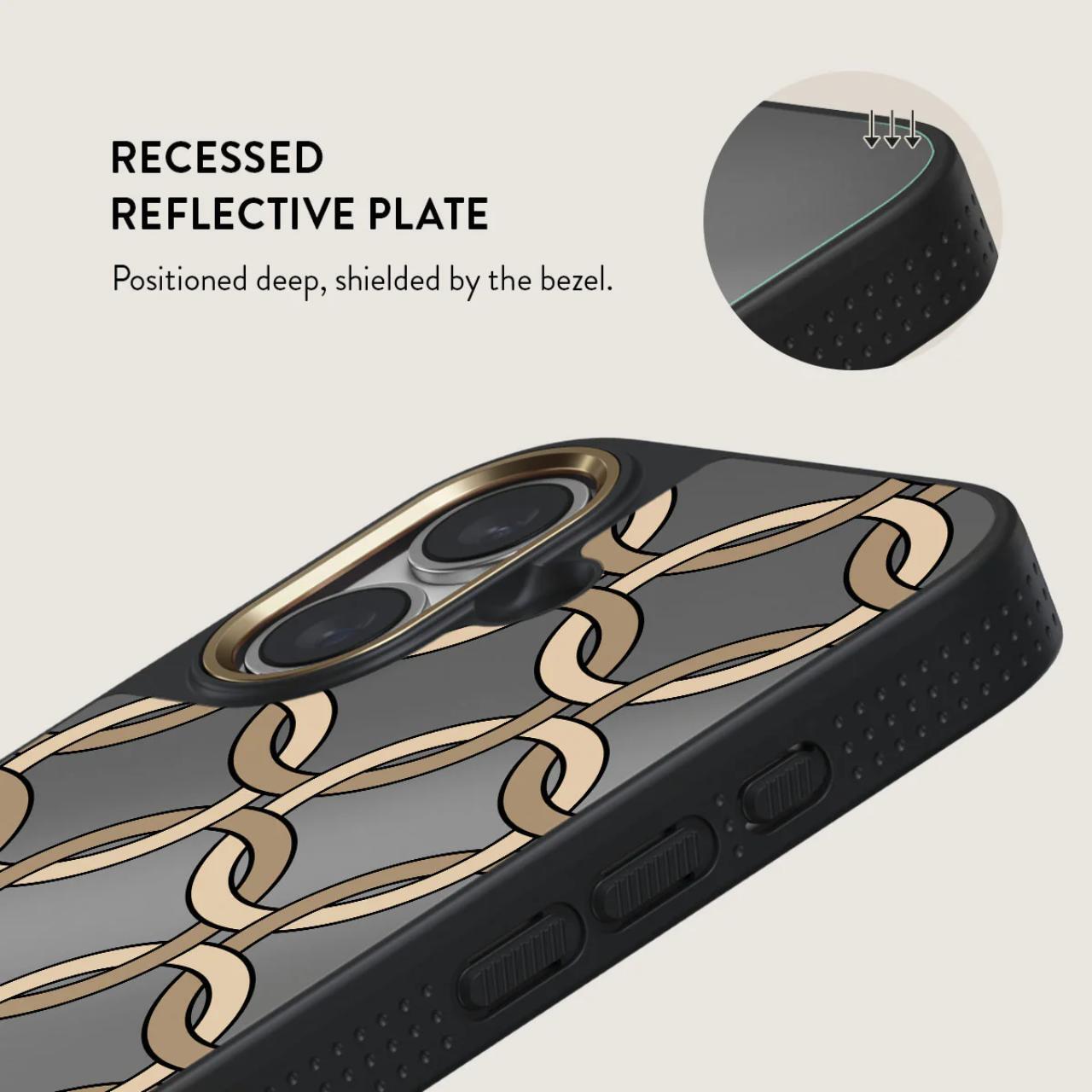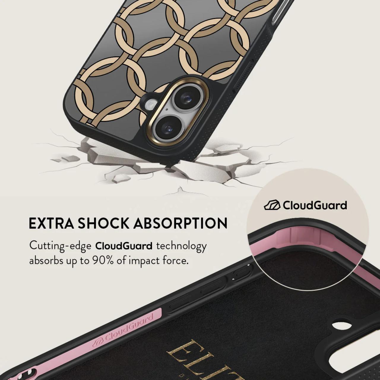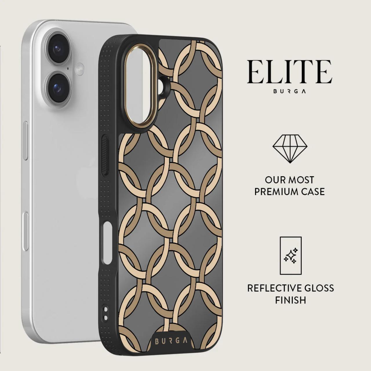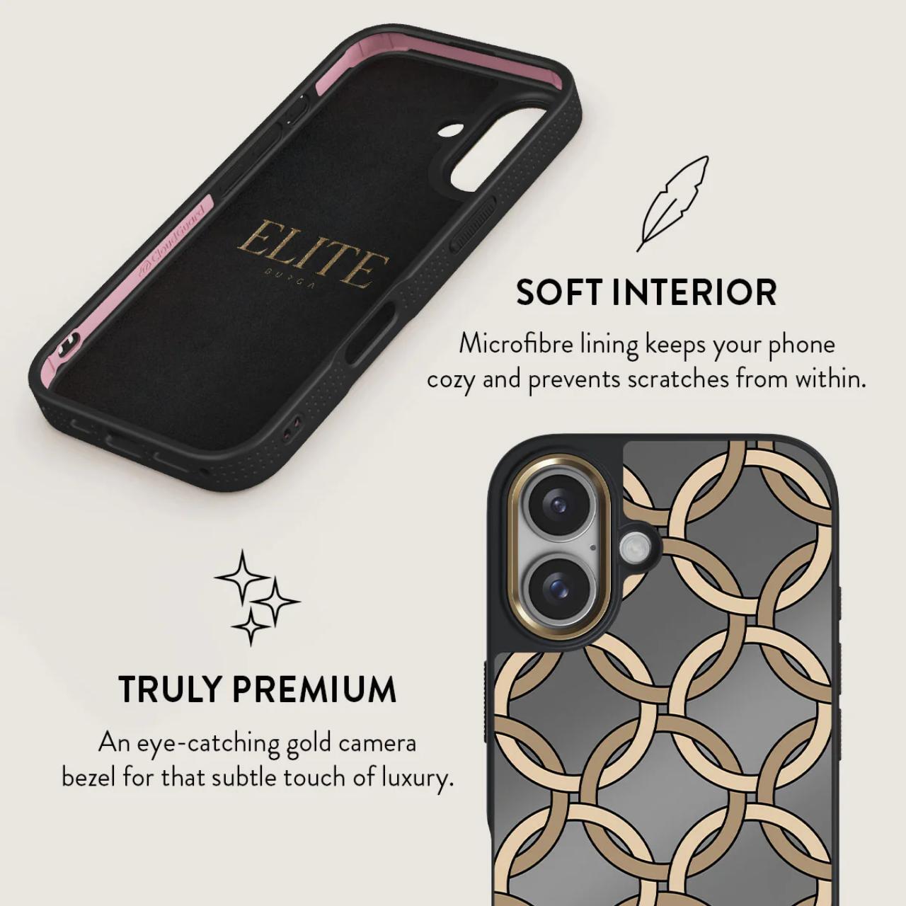 Burga Elite Mirror Magsafe Gold Heritage iPhone 16 Case built for shock absorption and protection, features the latest CloudGuard technology and an elegant, mirror-like finish. And the microfiber interior keeps the phone comfortable and prevents scratches.