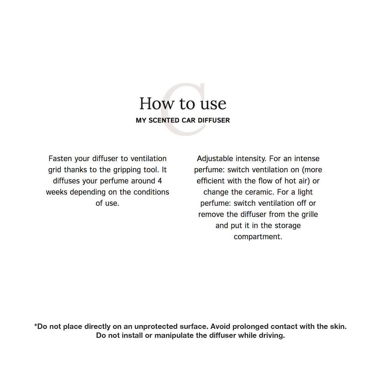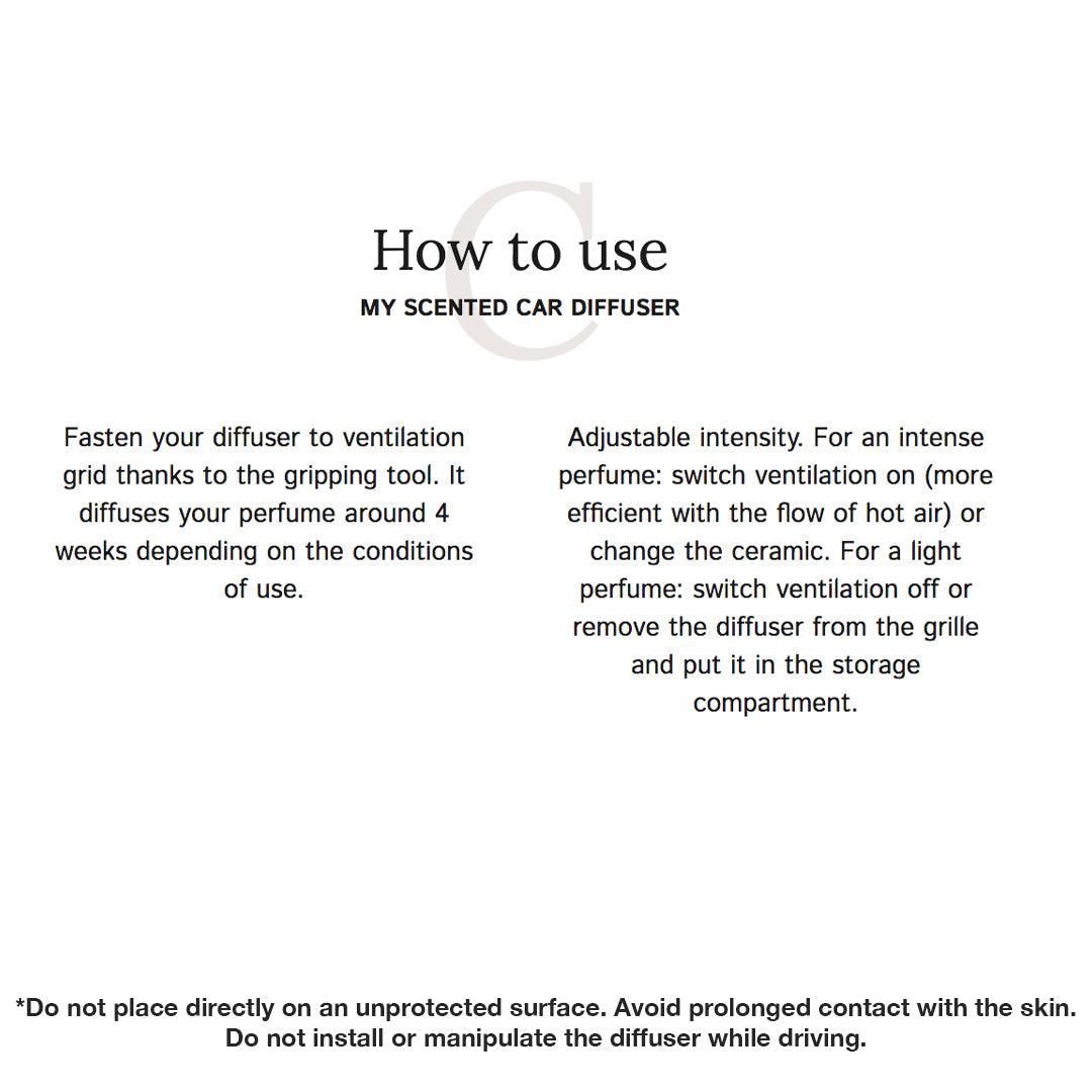 Place the scented ceramic tablet into the diffuser box. Then insert the clip into the dedicated space on the back of the speaker. Attach the diffuser to the ventilation grills using its clip. It diffuses your perfume for about 4 weeks depending on the conditions of use.