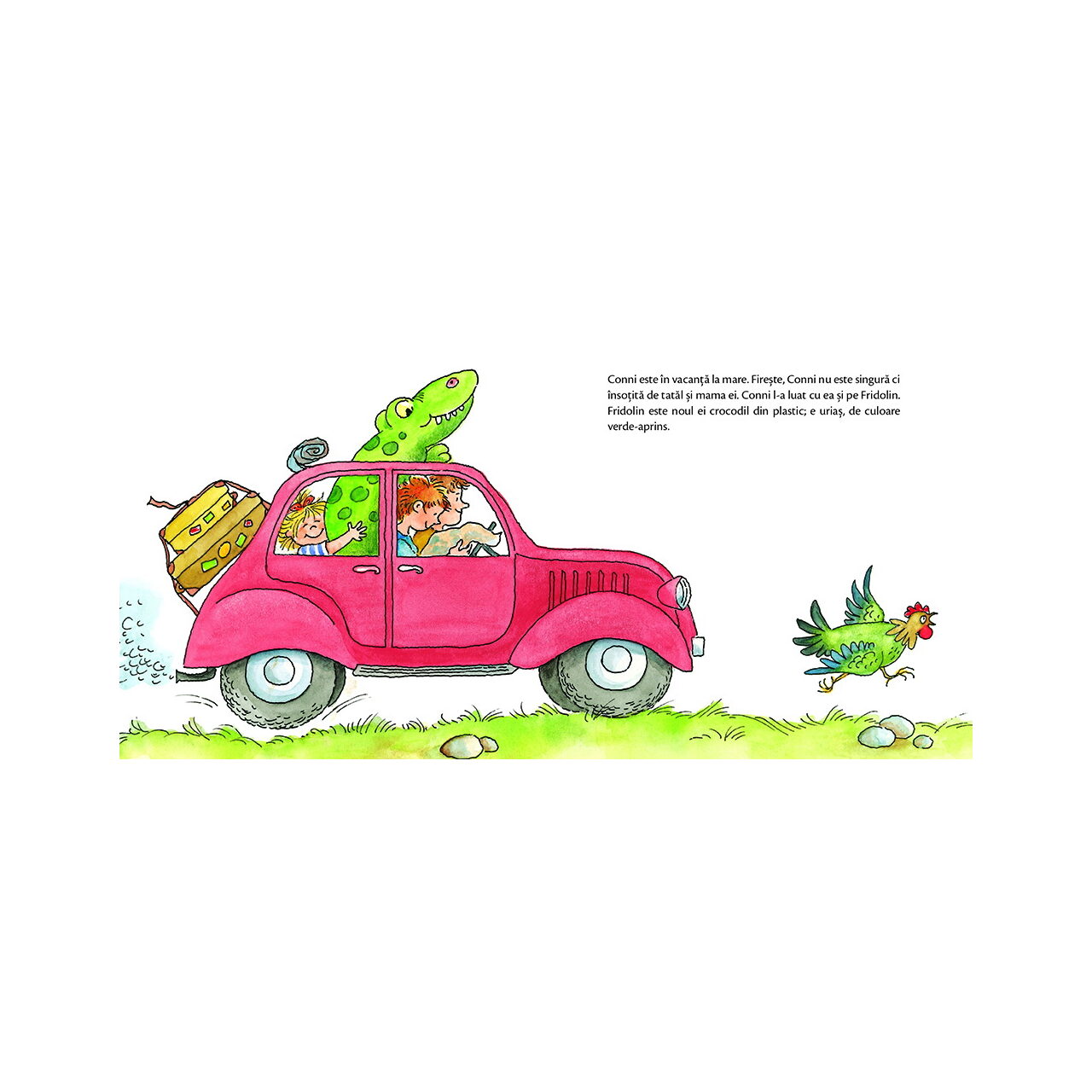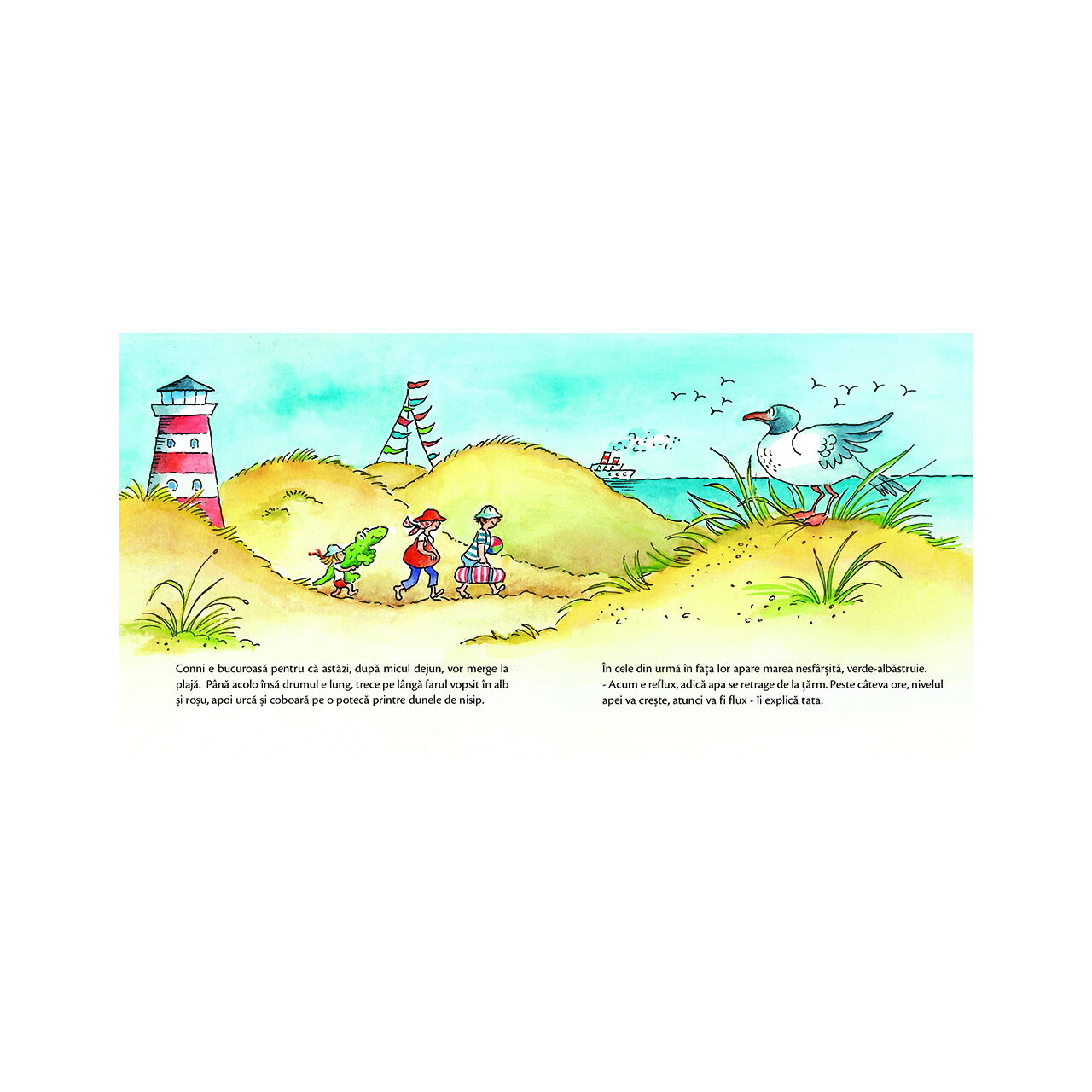 Conni este în vacanță la mare. Desigur, Conni nu merge singură la plajă, ci însoțită de mama și tata. Și de crocodilul ei mare și verde, din plastic, Fridolin.