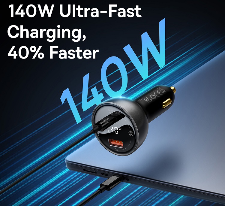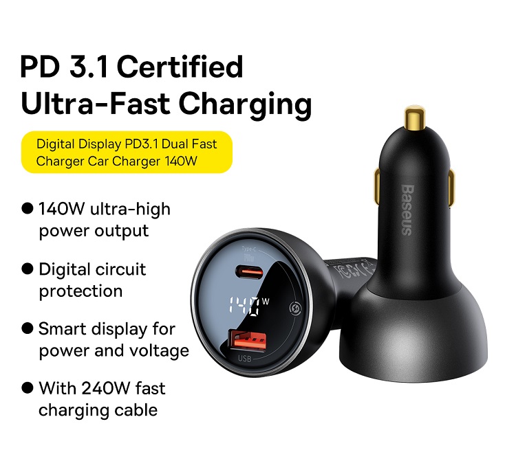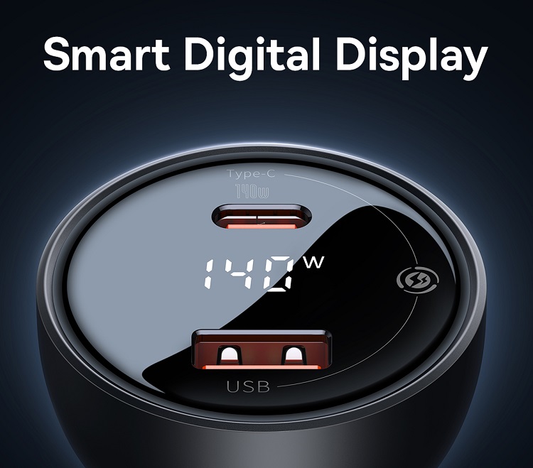 Das Ladegerät ist mit zwei Ausgangsanschlüssen ausgestattet – USB-C und USB-A, das viele Schnellladestandards unterstützt, darunter PD3.1, QC3.0, PPS, SCP, FCP, und die maximale Ladeleistung beträgt 140 W (USB-C) bzw. 30 W (USB-A). Darüber hinaus verfügt das Produkt über eine Digitalanzeige, die über die aktuelle Ladeleistung und die Spannung der Autobatterie informiert.
