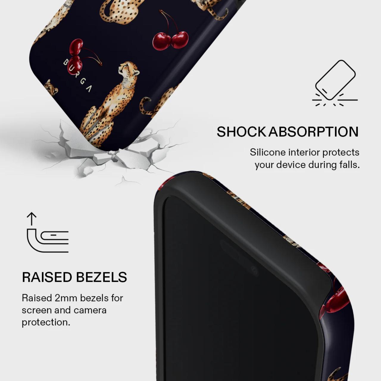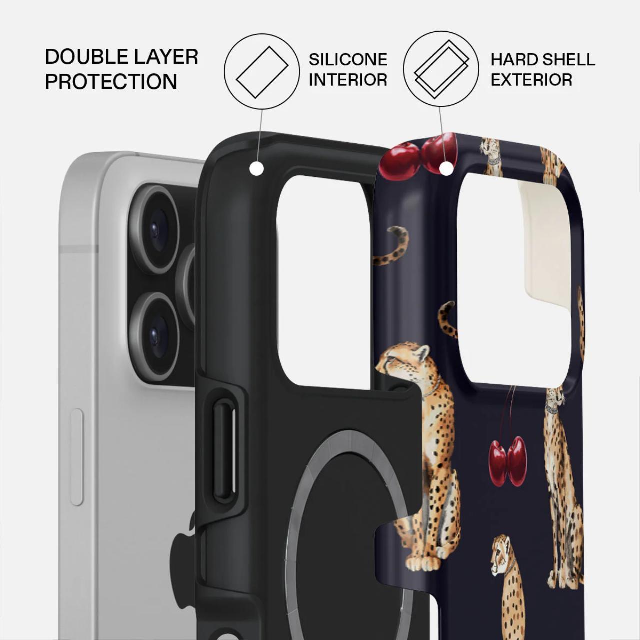 Die Dual Layer Magsafe Cougar Hülle für das iPhone 17 Pro von Burga hat ein einzigartiges und farbenfrohes Muster und die Innenseite aus Silikon schützt das Gerät bei Stürzen, während die 2 mm erhöhten Einfassungen Bildschirm und Kamera schützen.