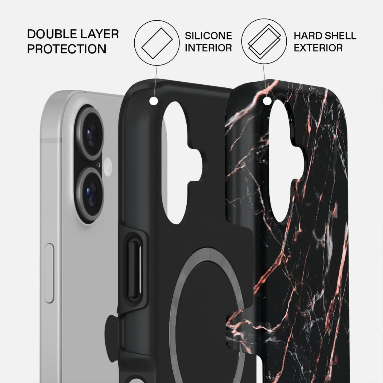 Die Dual Layer Magsafe Rose Gold Marble Hülle für das iPhone 17 von Burga hat ein einzigartiges und farbenfrohes Muster und die Innenseite aus Silikon schützt das Gerät bei Stürzen, während die 2 mm erhöhten Einfassungen Bildschirm und Kamera schützen.