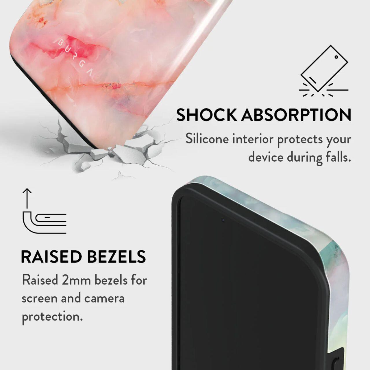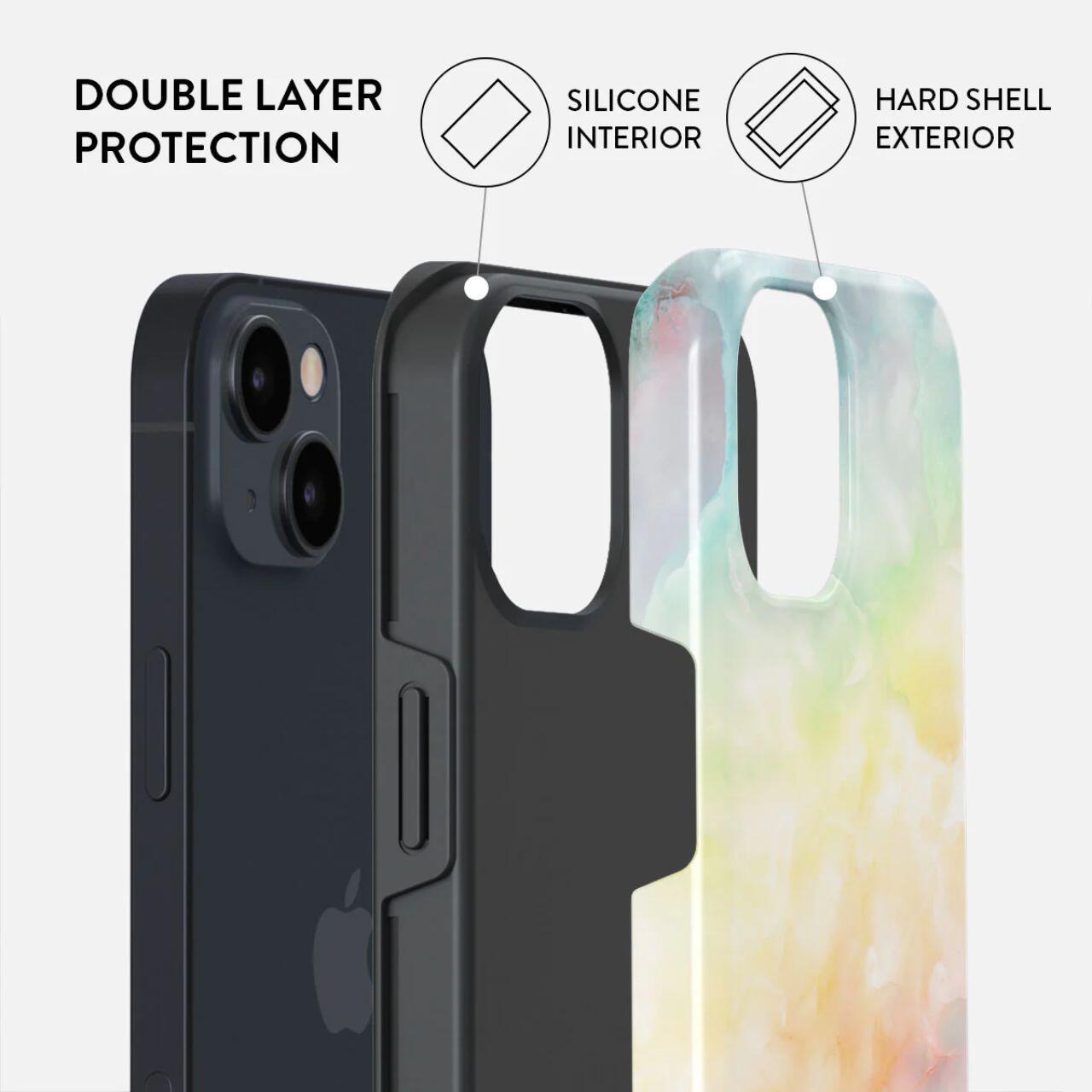 Dual Layer Case New Flame Rainbow für iPhone 15 von Burga hat ein einzigartiges und farbenfrohes Modell, und die Silikoninnenseite schützt das Gerät bei Stürzen, während die 2 mm erhöhten Rahmen Bildschirm- und Kameraschutz bieten.