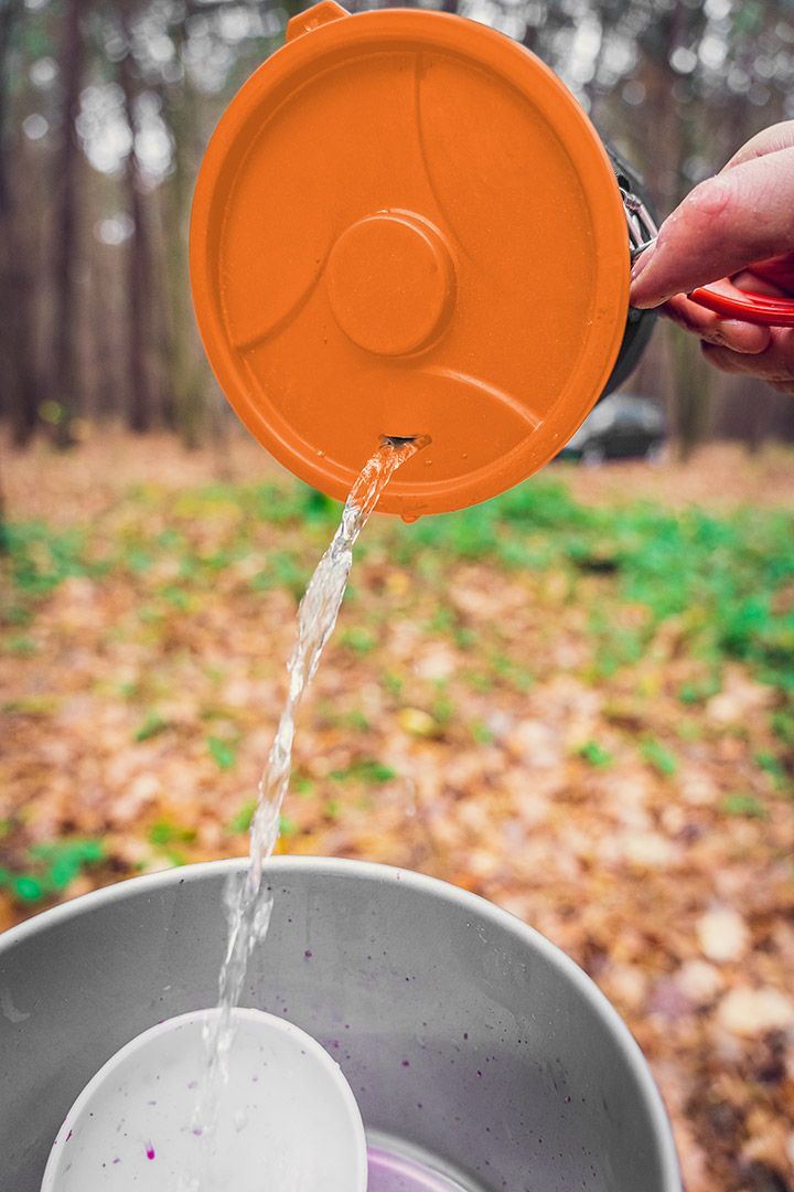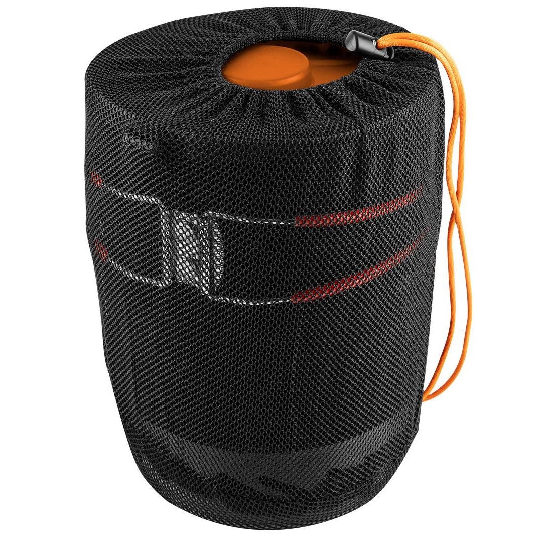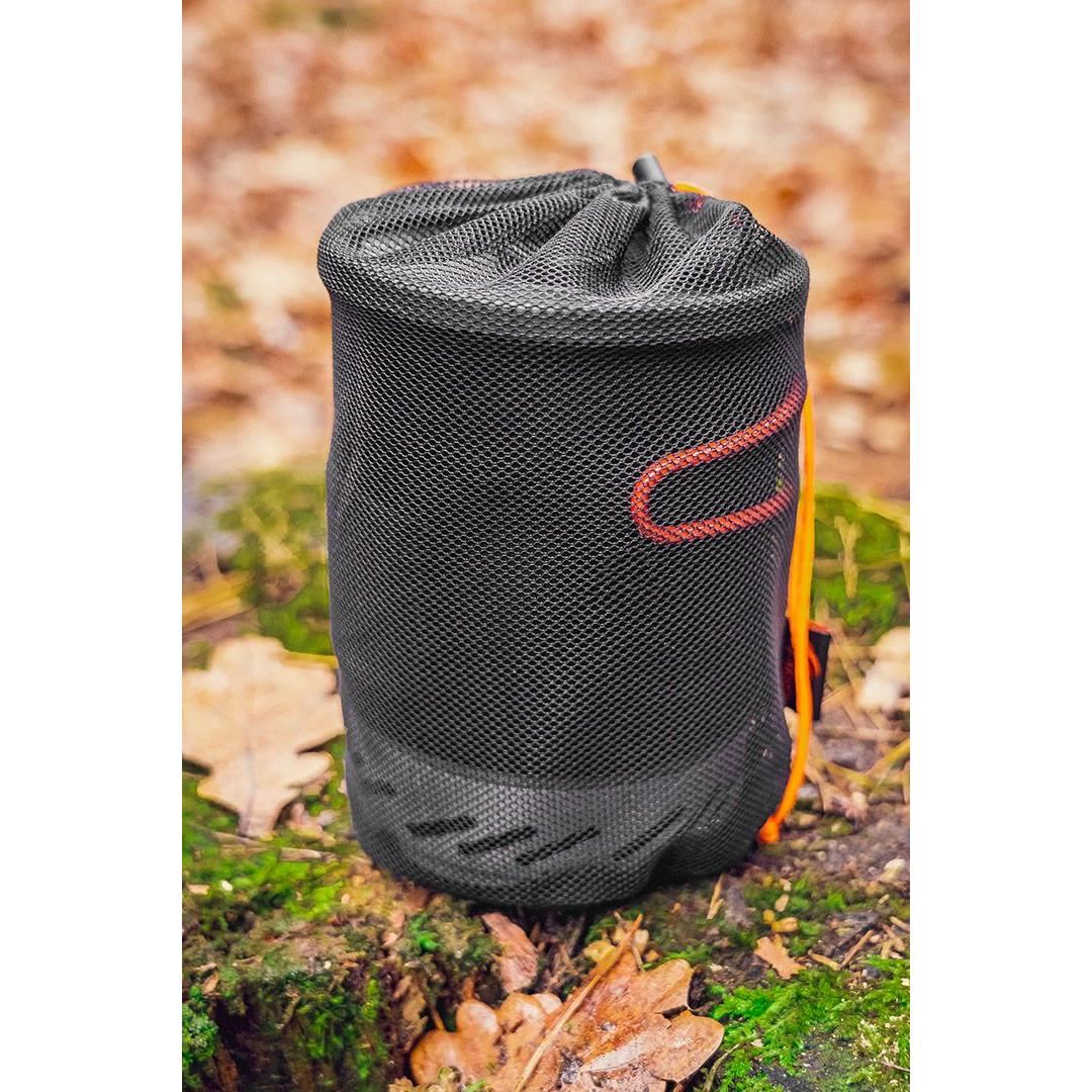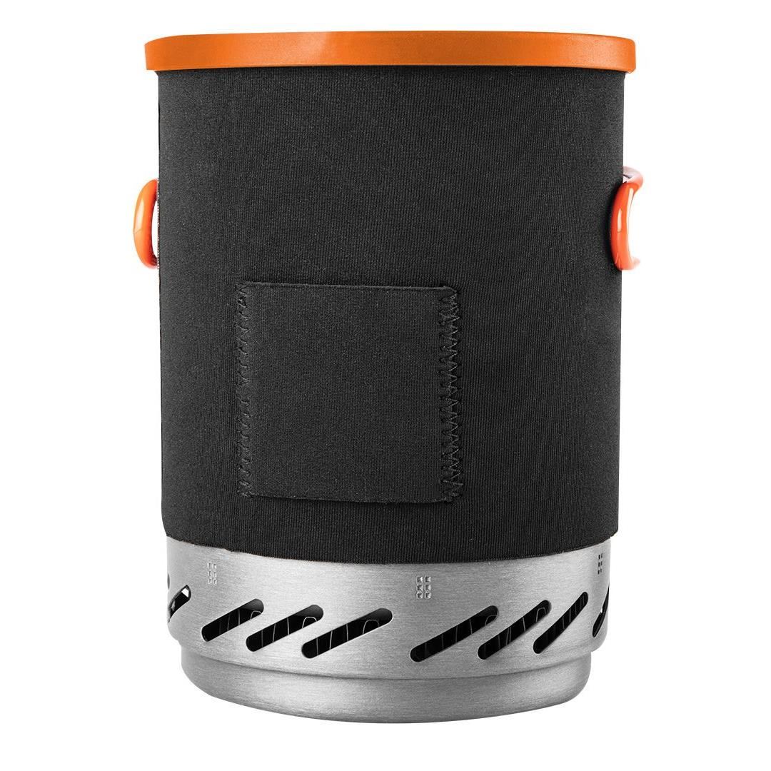 Die Schale ist aus eloxiertem Aluminium gefertigt und zusätzlich mit einer Neoprenhülle überzogen. Die klappbaren, isolierten Griffe erhitzen sich nicht und nehmen beim Transport wenig Platz ein. Dank des Grills, der die Flamme vor Wind schützt, ist der Ofen um bis zu 30 % effizienter.