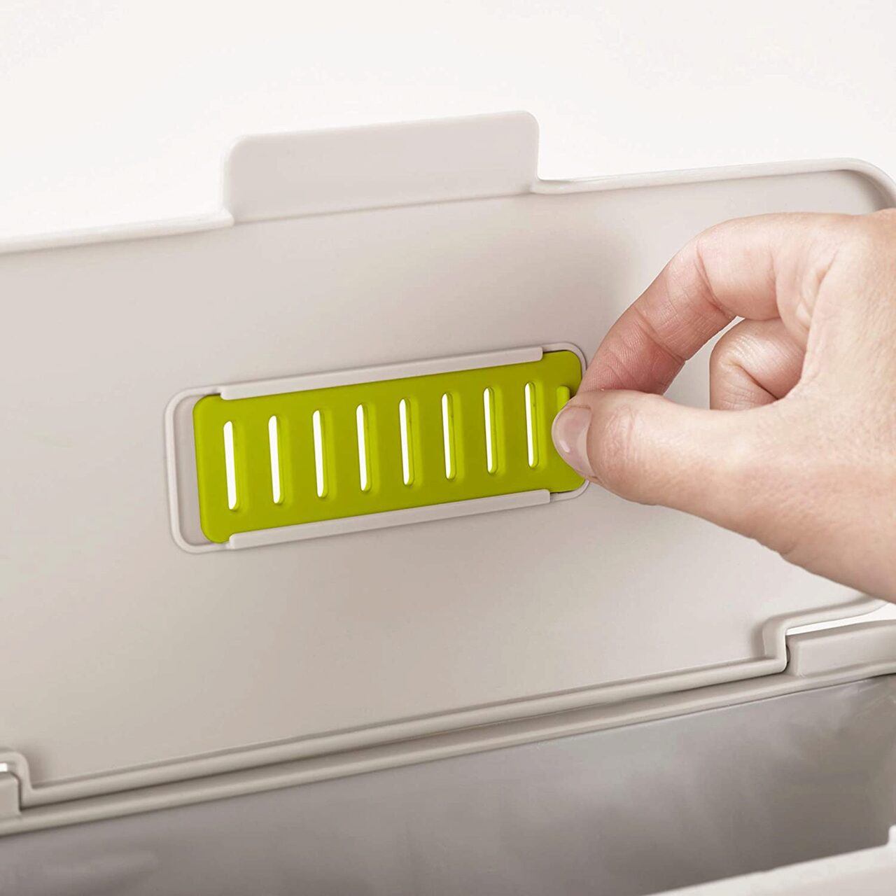 Dieser kompakte, schlanke Lebensmittelabfallbehälter wurde speziell entwickelt, um das Sammeln von Speiseresten zu erleichtern. Es verfügt über einen hochklappbaren Deckel und eine erweiterte Öffnung. Einstellbare Belüftung: offen – hilft, Feuchtigkeit und Geruch zu reduzieren; geschlossen - bietet eine Barriere gegen Insekten. Fassungsvermögen: 4 Liter. Von Hand waschen und trocknen.