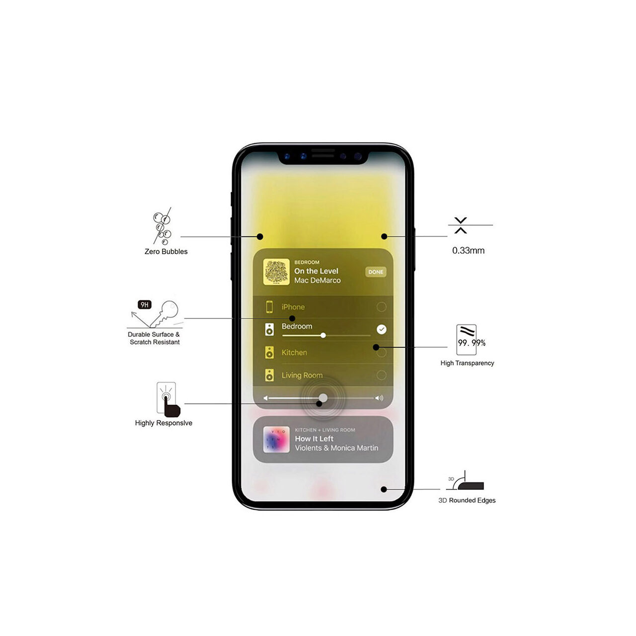 Es ist nur 0,33 mm dick und bietet maximale Klarheit, da es 100 % transparent ist. Sie verfügt über eine oleophobe Schutzschicht, die vor Flecken und Fingerabdrücken schützt.