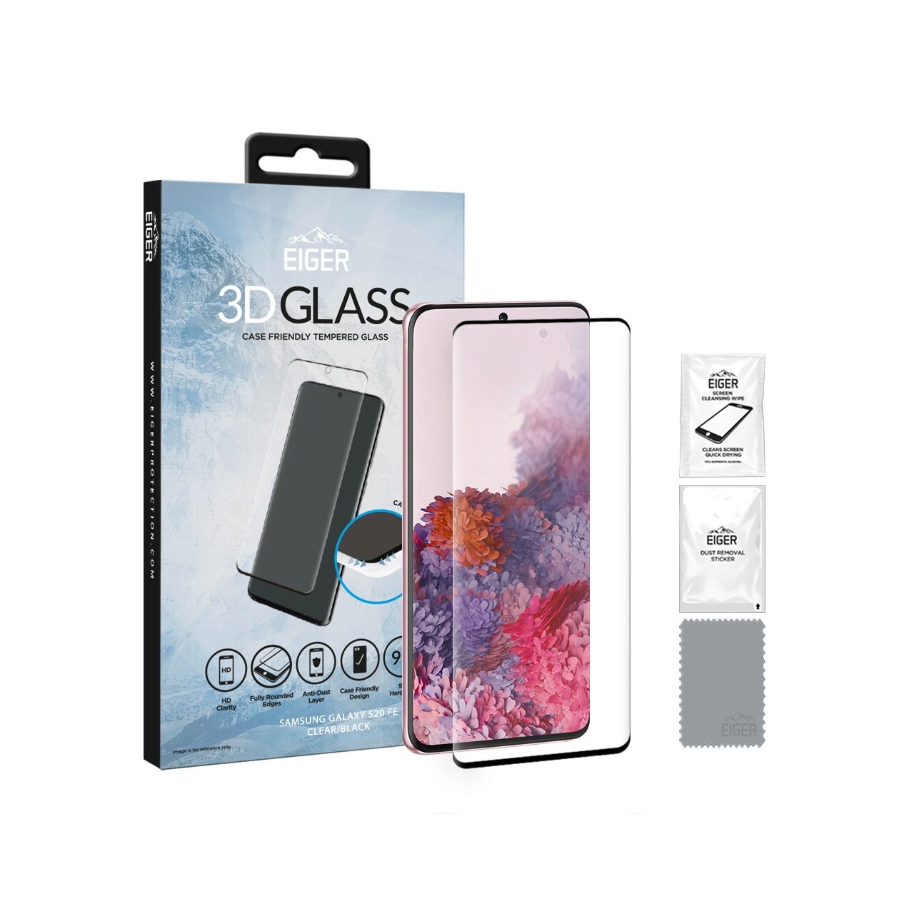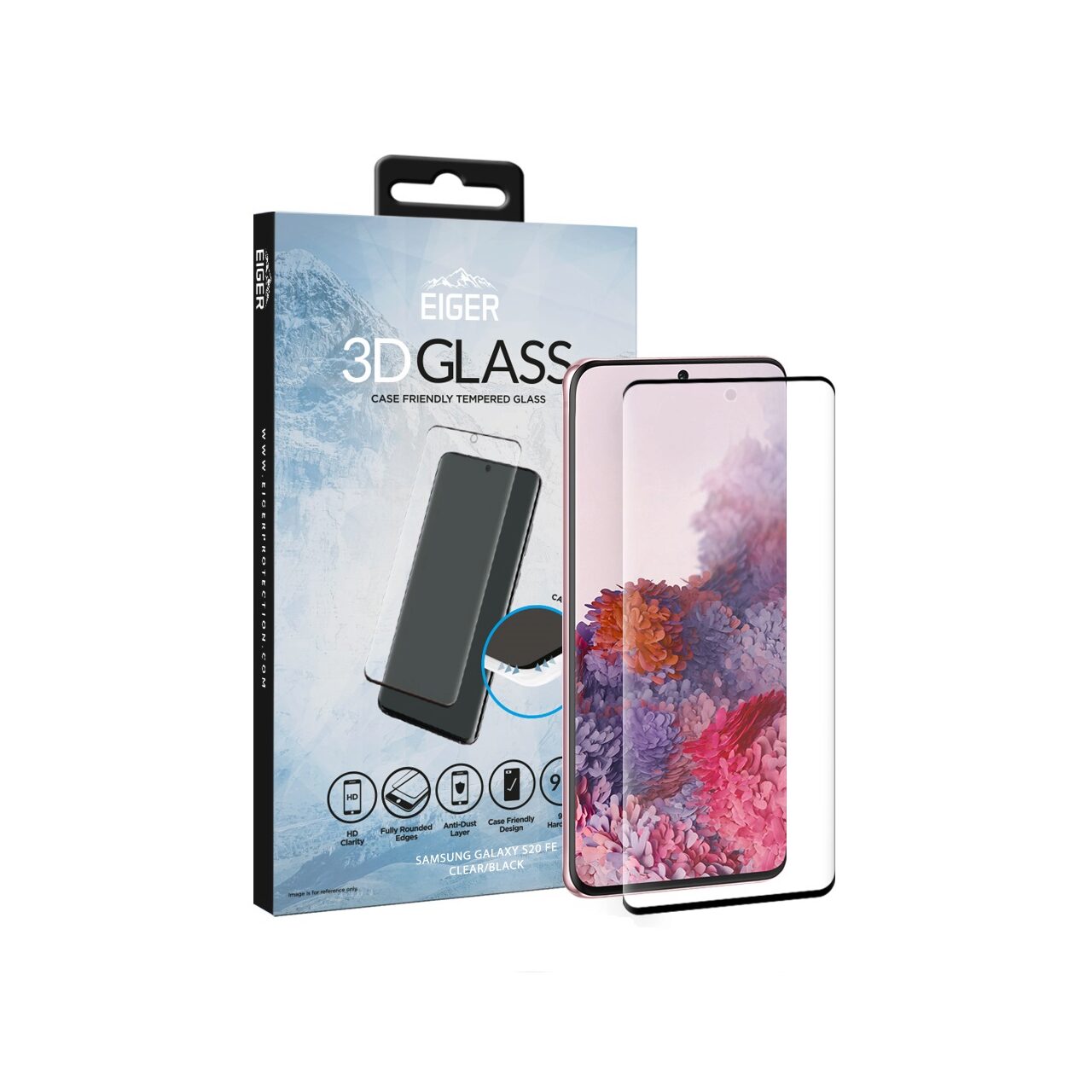 Eiger 3D-hüllenfreundliche Glasfolie für Samsung Galaxy S20 FE G780, transparentes Schwarz (0,33 mm, 9H, gebogen)
