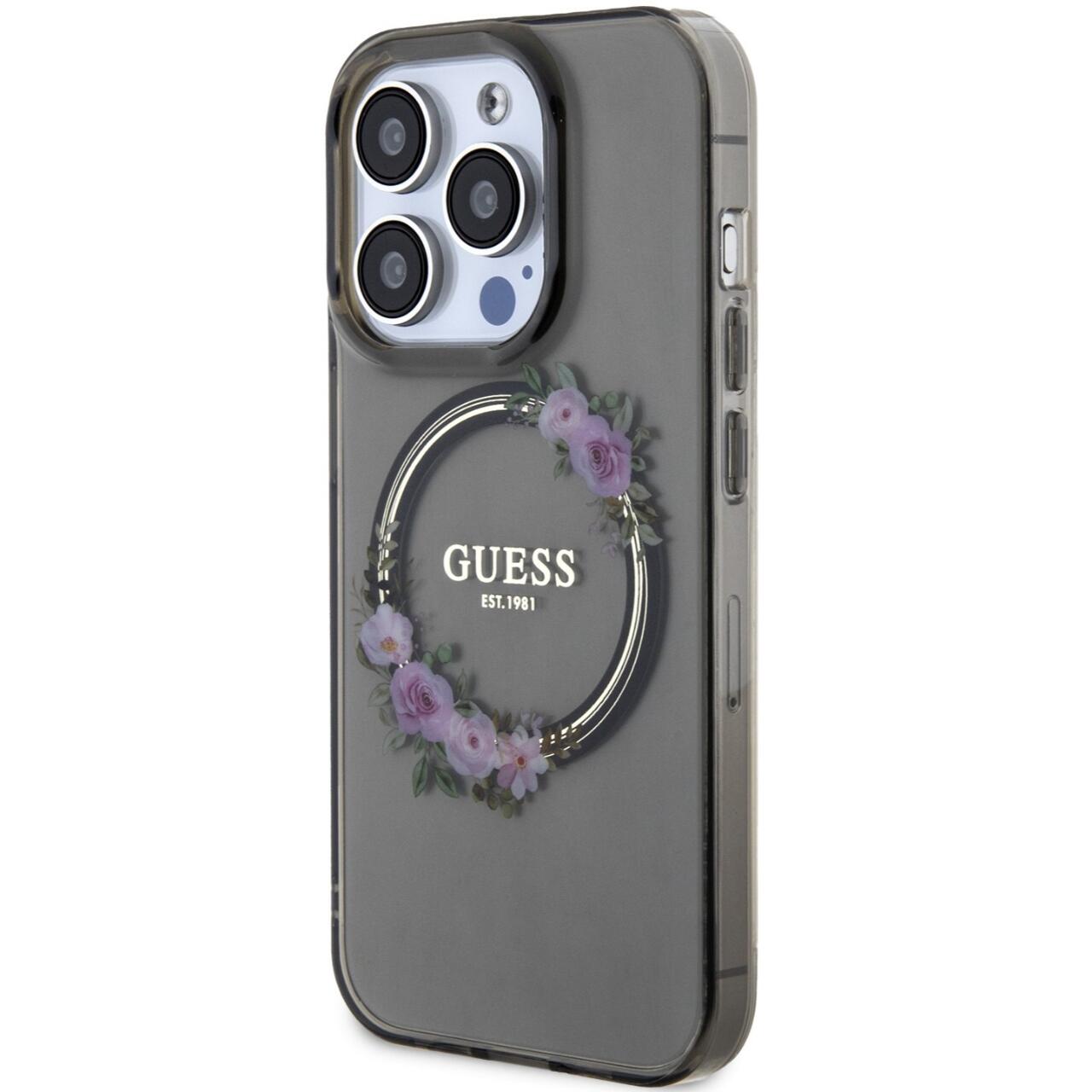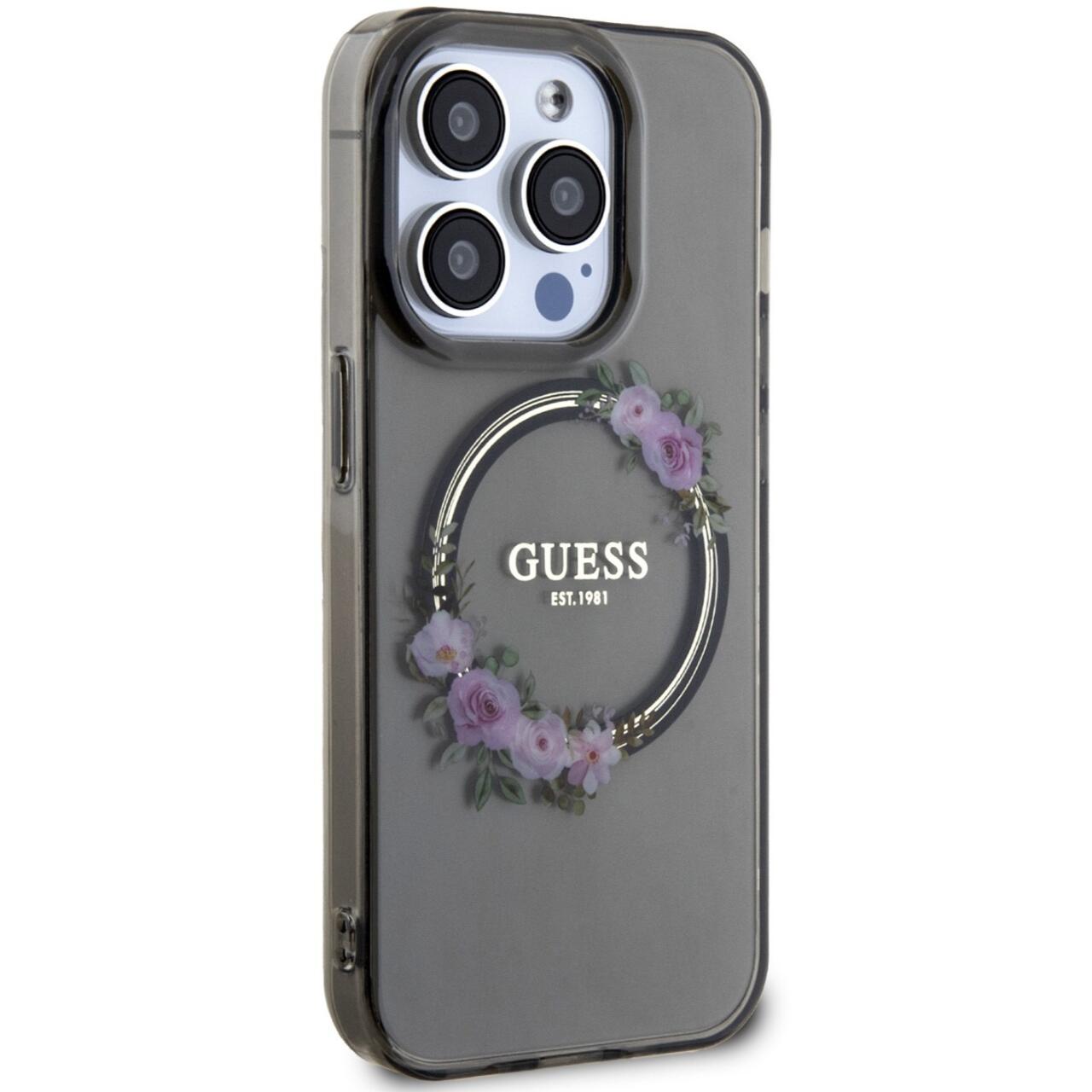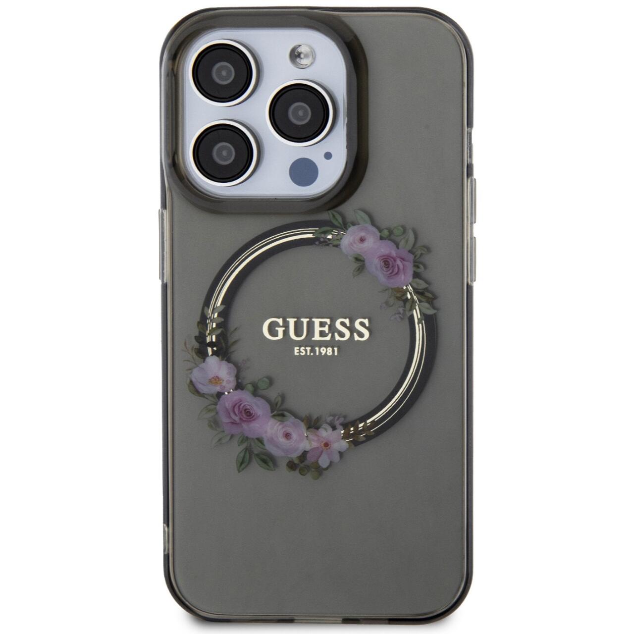 Die glänzende MagSafe-Hülle „Flowers Ring Logo“ von Guess für das iPhone 15 Pro besteht aus strapazierfähigen Materialien, die dem Telefon Widerstandsfähigkeit gegen unerwünschte Kratzer und Beschädigungen bieten.