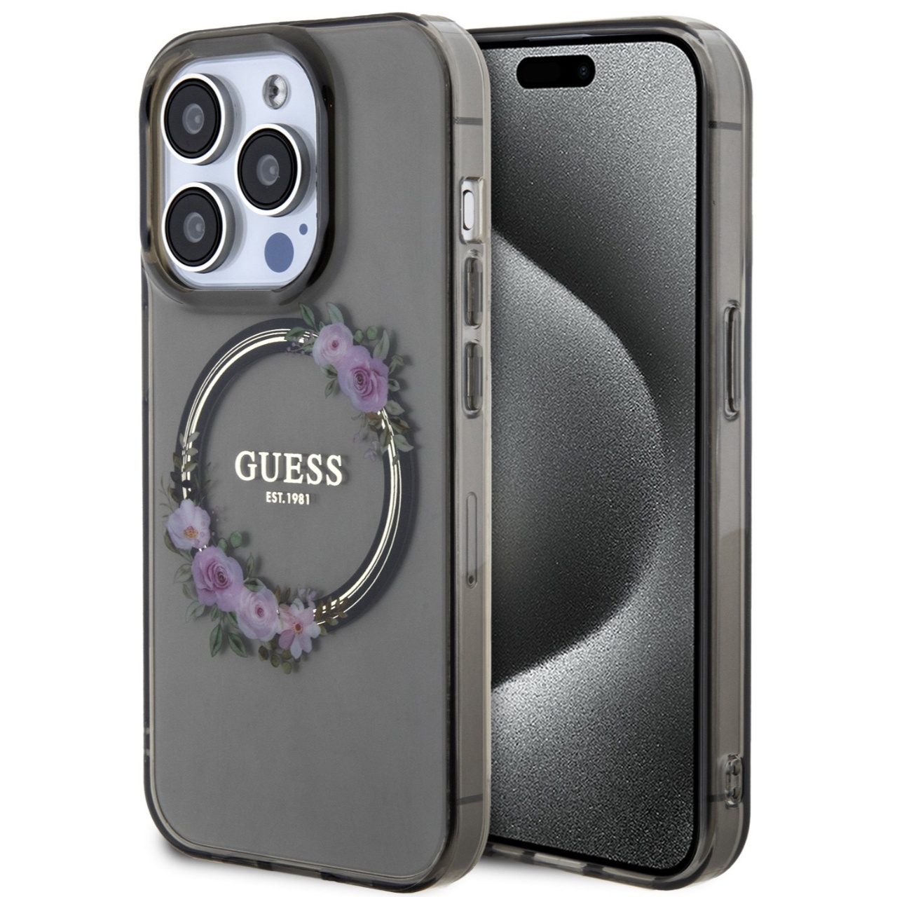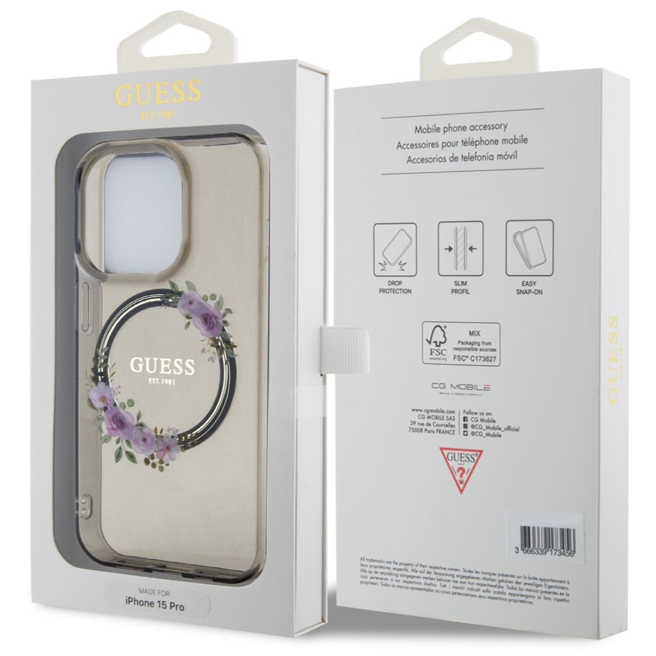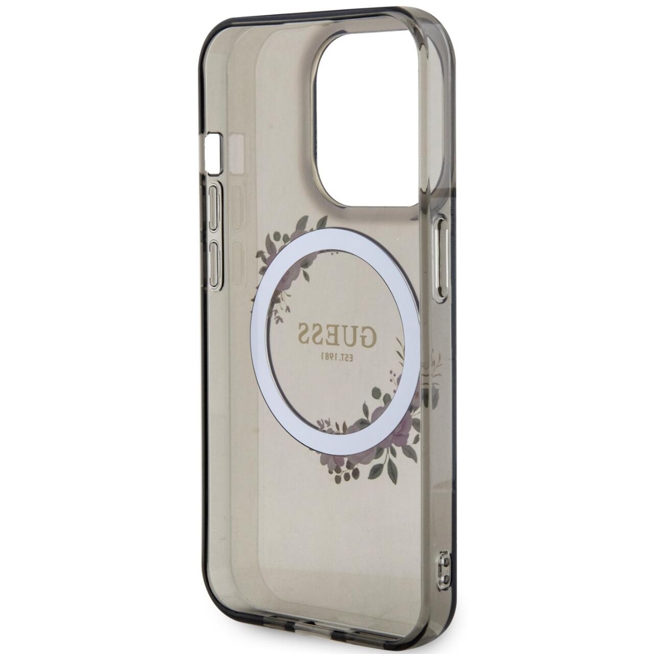 Die glänzende MagSafe-Hülle „Flowers Ring Logo“ von Guess für das iPhone 15 Pro besteht aus strapazierfähigen Materialien, die dem Telefon Widerstandsfähigkeit gegen unerwünschte Kratzer und Beschädigungen bieten.