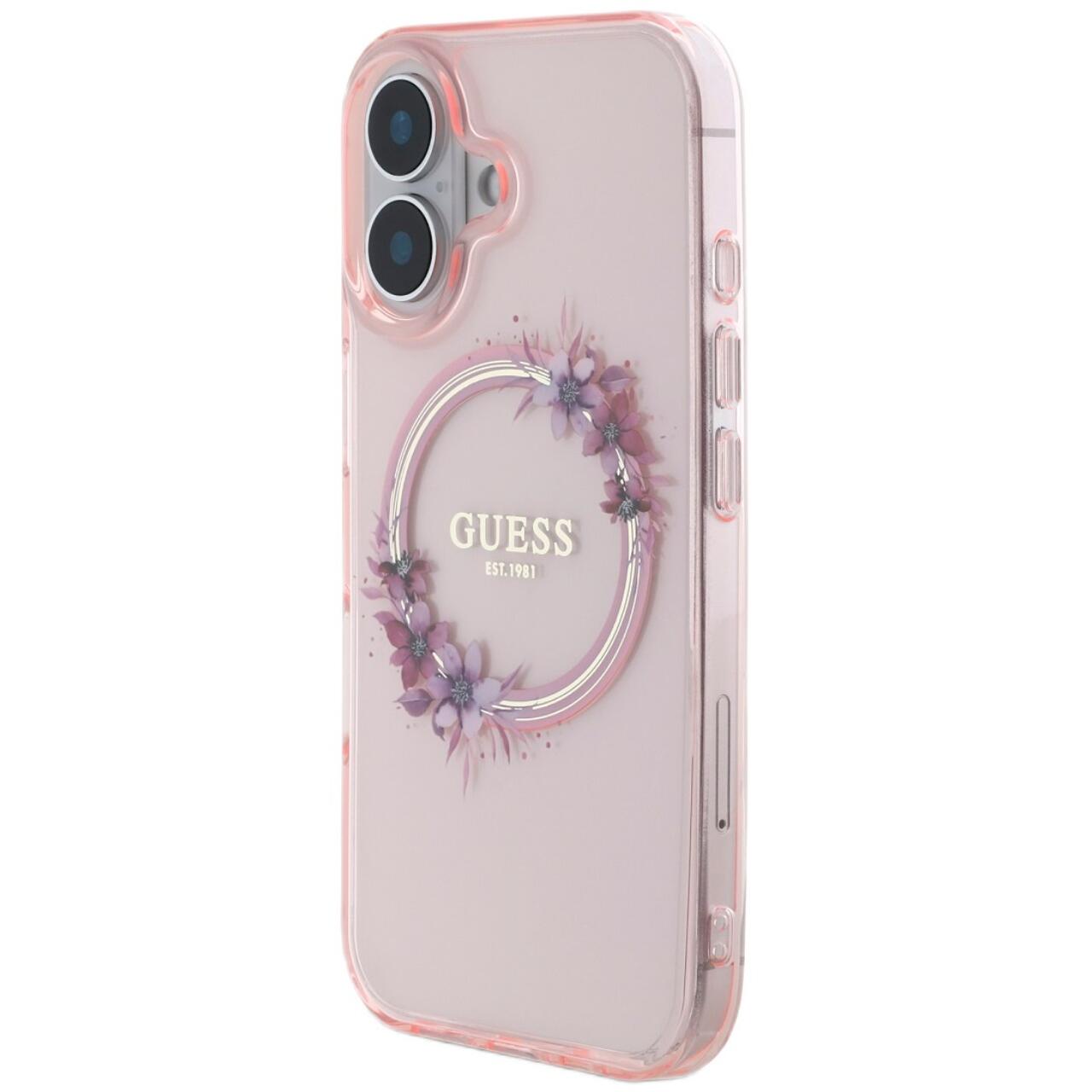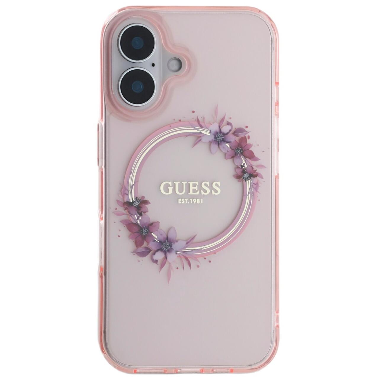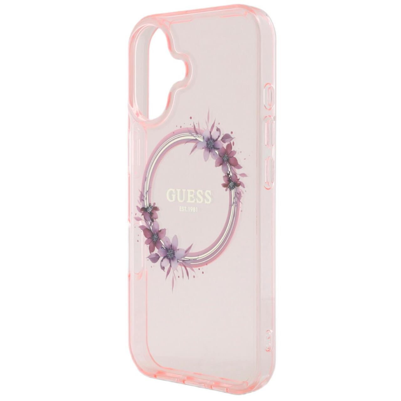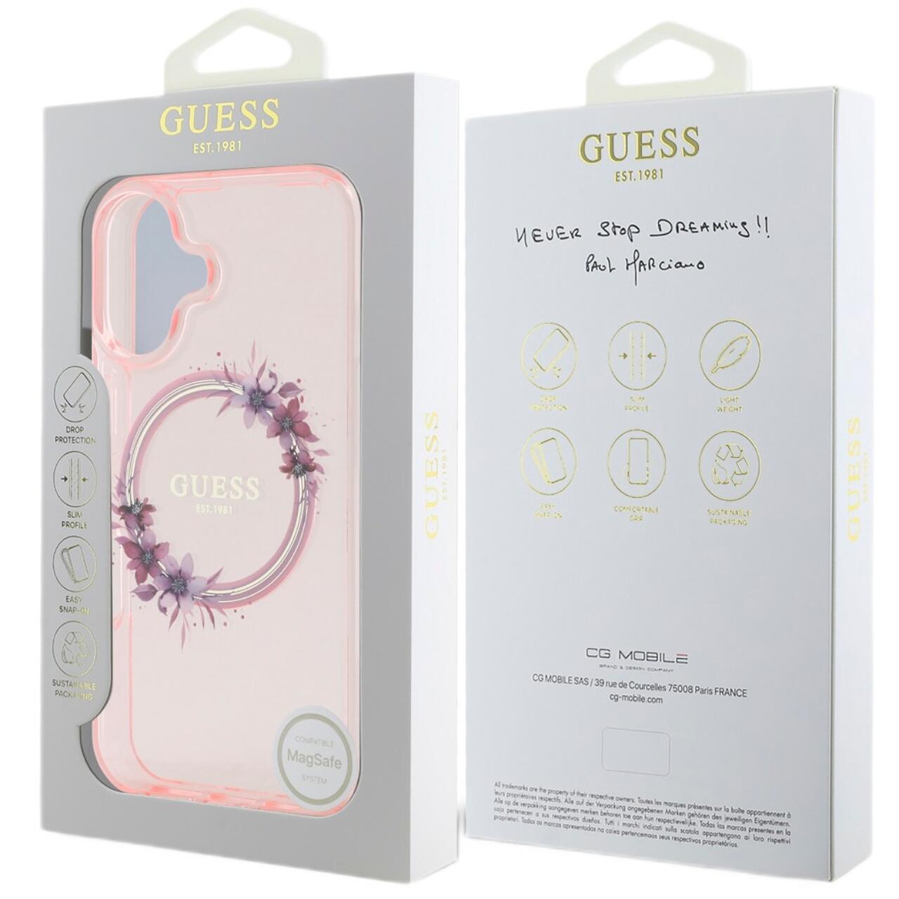 Flowers Ring MagSafe iPhone 16 Hülle Pink von Guess, besteht aus strapazierfähigen Materialien, die dem Telefon Widerstandsfähigkeit gegen Kratzer und unerwünschte Beschädigungen bieten