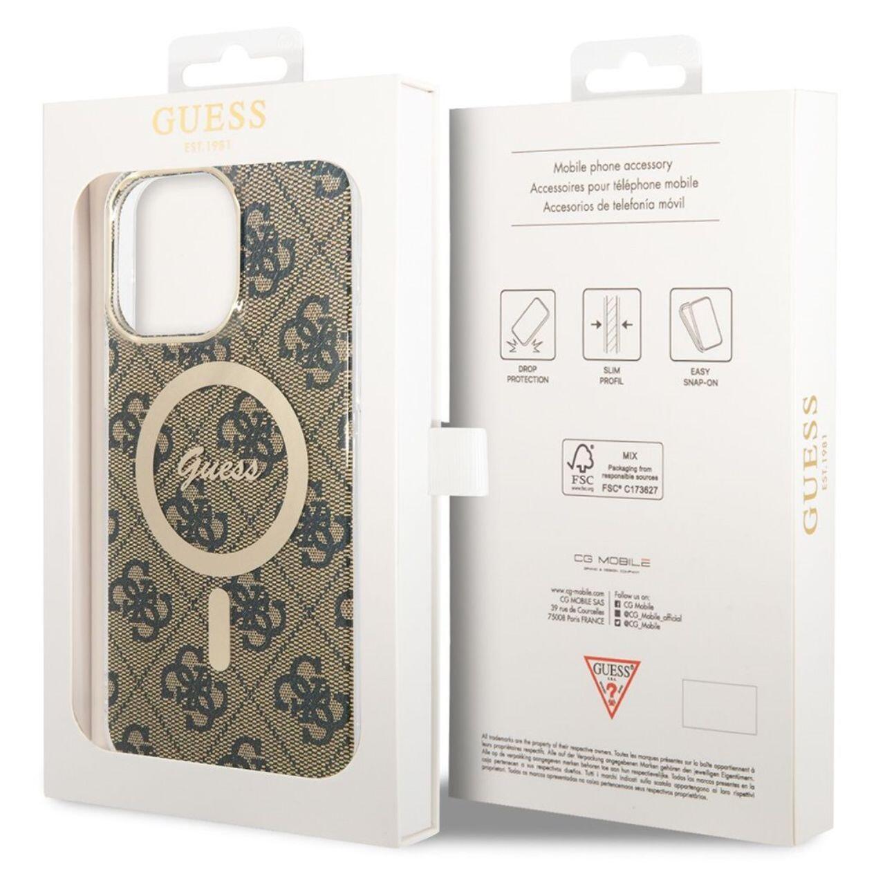Guess Case 4G MagSafe für iPhone 15 Pro, ist ideal zum Schutz Schützen Sie Ihr Telefon vor Staub, Kratzern oder leichten Stößen. Dank der flexiblen Kanten lässt sich die Hülle einfach anbringen. Darüber hinaus müssen Sie sie nicht entfernen, wenn Sie das Telefon drahtlos aufladen möchten, da sie MagSafe-kompatibel ist.