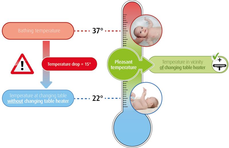 Es spendet dem Baby sofort angenehme Wärme und schützt es vor Erkältungen aufgrund großer Temperaturschwankungen.Die natürliche Immunität und die Schutzfunktionen der Haut brauchen Zeit zum Reifen. Die Haut des Babys ist fünfmal dünner als die Haut eines Erwachsenen und reagiert daher empfindlicher auf schnelle Kältewechsel. Die empfohlene Badewassertemperatur beträgt 37 °C und die Temperatur im Babyzimmer (ohne Heizung) beträgt in der Regel 22-24 °C. In der Praxis gibt es vom Moment des Badens bis zum Moment des Anziehens des Babys einen Temperaturunterschied von bis zu 15 °C, bei dem die Gefahr einer Erkältung besteht. Die Heizung sorgt schnell für eine angenehme Temperatur rund um den Wickeltisch von ca. 30 °C.