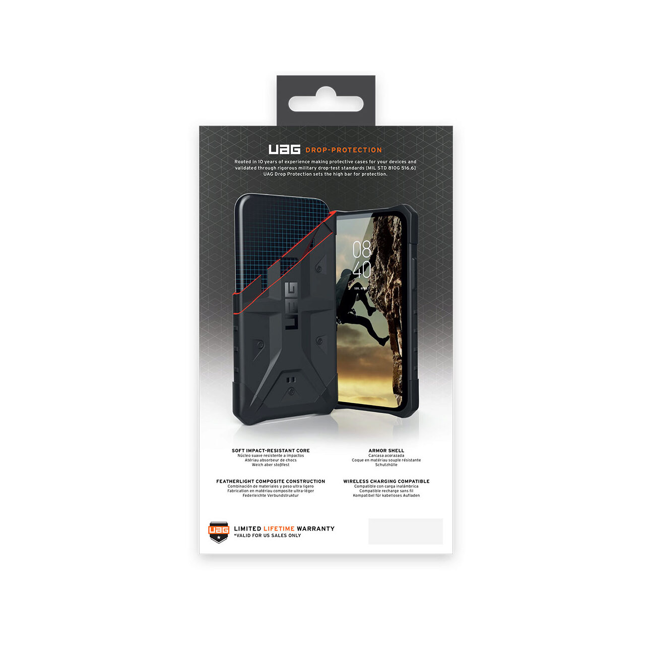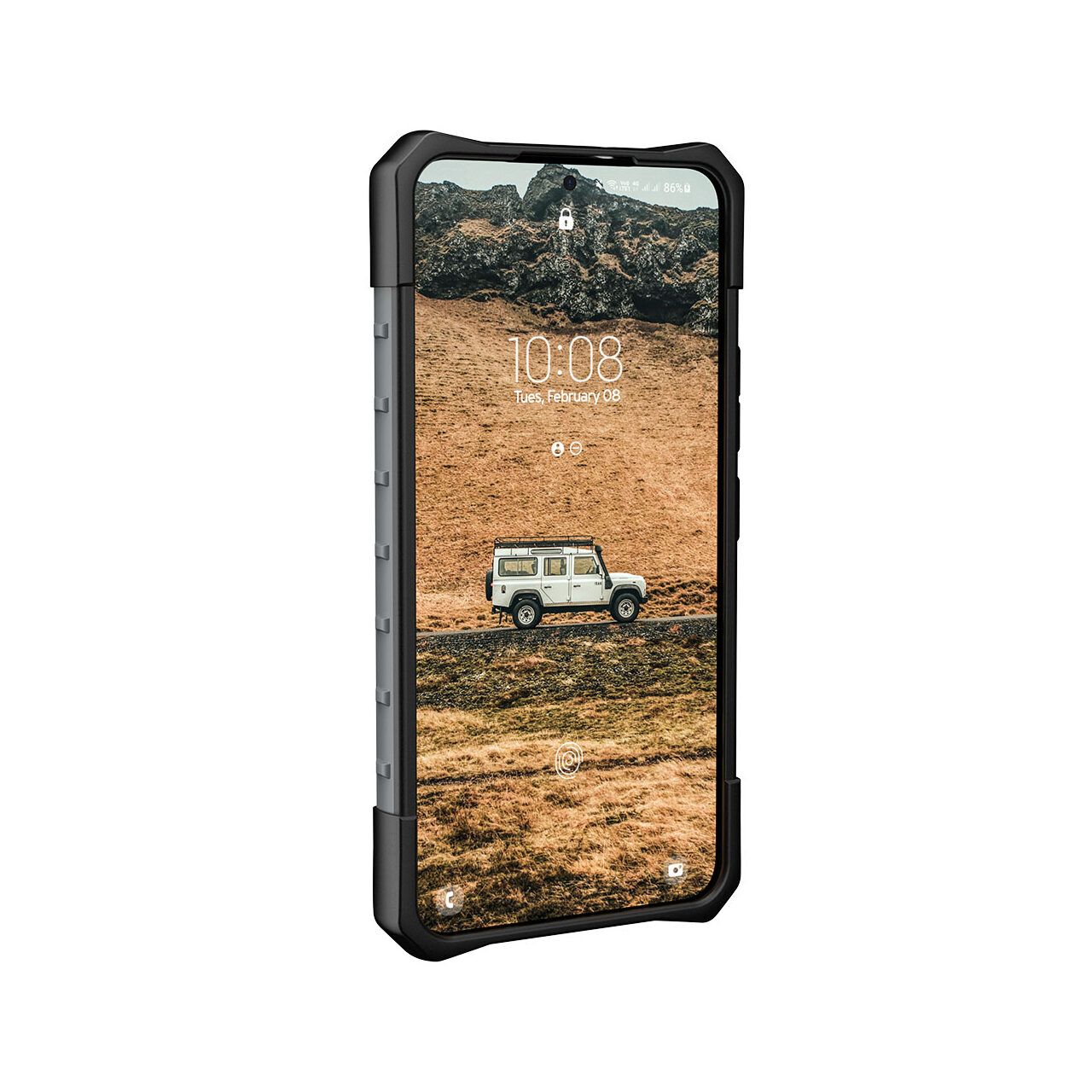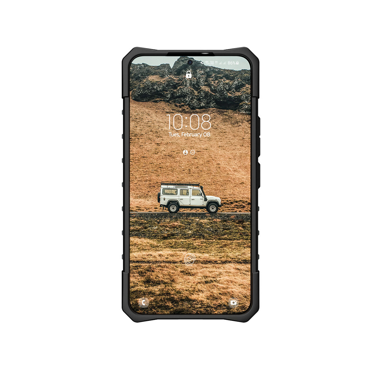 Pathfinder Series-Hülle für das Samsung Galaxy S22 Plus von UAG besteht aus hochwertigen Materialien, die Stöße erfolgreich absorbieren und vor Kratzern schützen. Die Kanten sind im Bereich der Knöpfe, oben und unten flexibel, die Ecken sind hervorgehoben und verstärkt. Erfüllt die militärischen Falltests MIL STD 810G 516.6 zum Schutz vor Stößen und Wassertropfen.