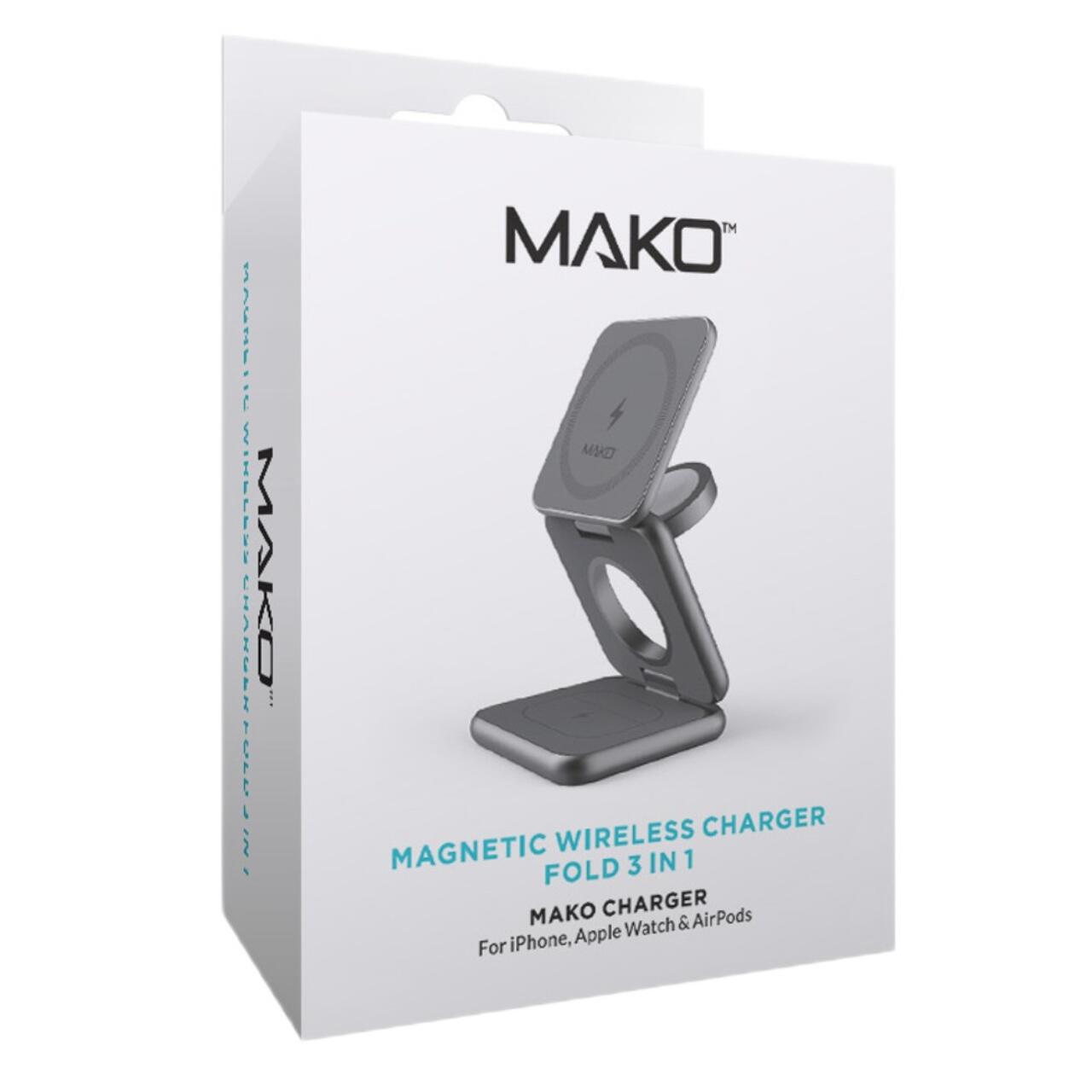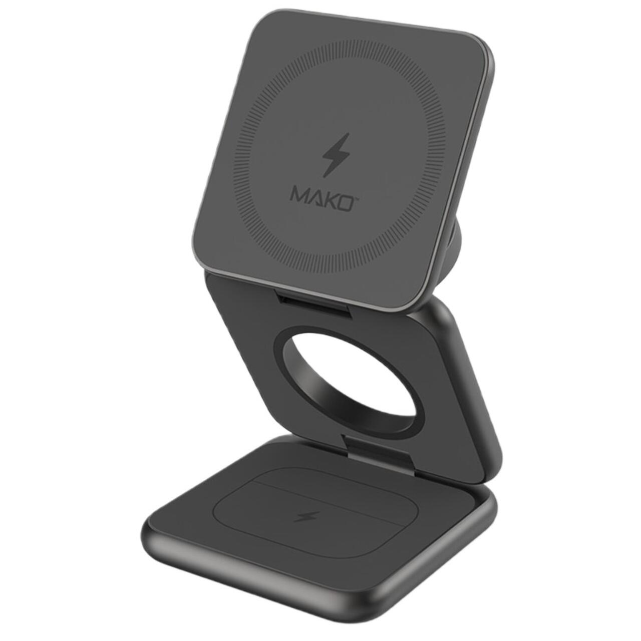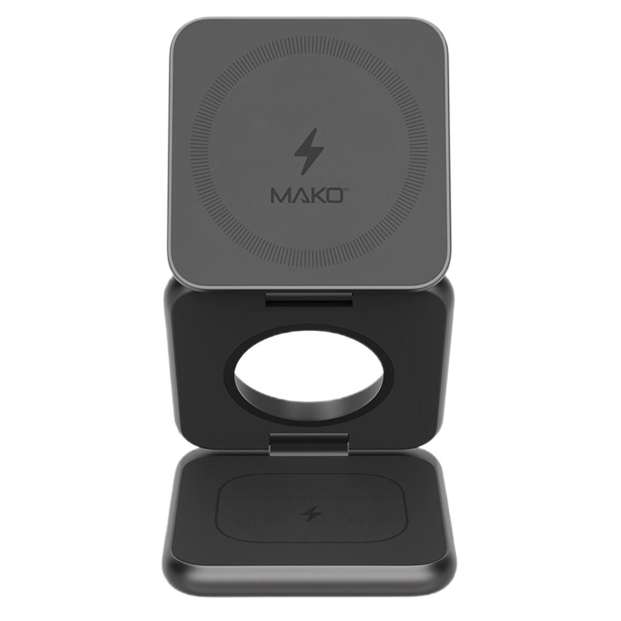 Das faltbare 3in1 Mangetic Wireless Charger von Mako ermöglicht durch die integrierte Qi-Technologie das schnelle Aufladen von iPhones mit einer Leistung von bis zu 15W und anderen Qi-kompatiblen Geräten und bietet so eine schnelle und sichere Lösung.
