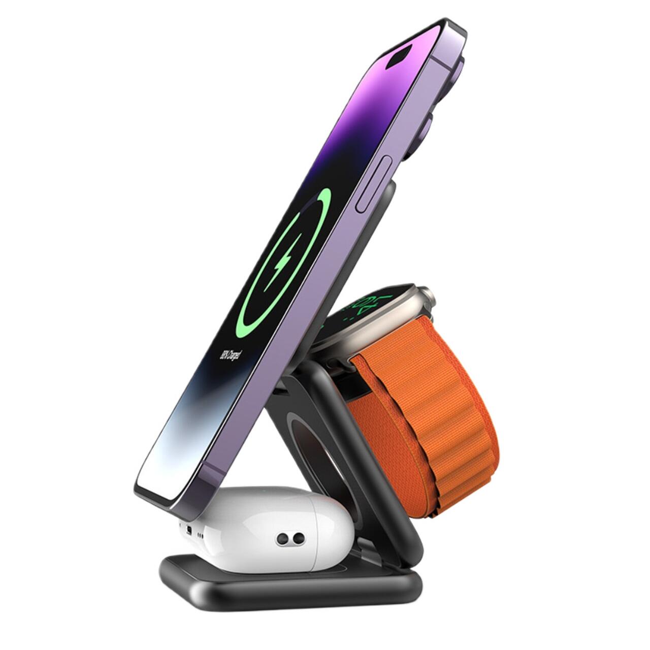 Die neue kabellose 3-in-1-Ladestation besteht aus hochwertigem Aluminium. Das faltbare Design ermöglicht die Verwendung des Ladegeräts im Büro, auf Reisen oder zu Hause. Dank des Designs können Smartphone, Smartwatch und AirPods gleichzeitig aufgeladen werden. Wird nur das iPhone geladen, liefert die Ladestation die volle Leistung von 15W.