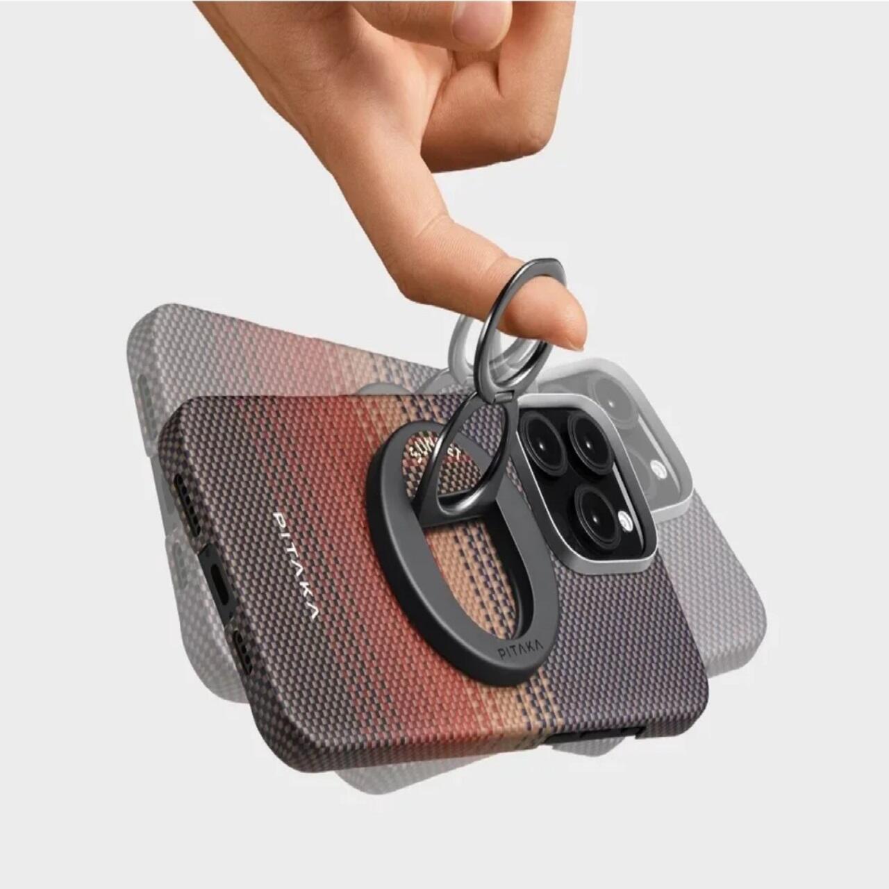 Der magnetische Telefonring MagEZ Grip 3 von Pitaka besteht aus Aramidfaser und Zinklegierung. Das Doppelringdesign bietet starken Halt, hält das Telefon sowohl im Quer- als auch im Hochformat stabil und gibt Ihre Hände frei.