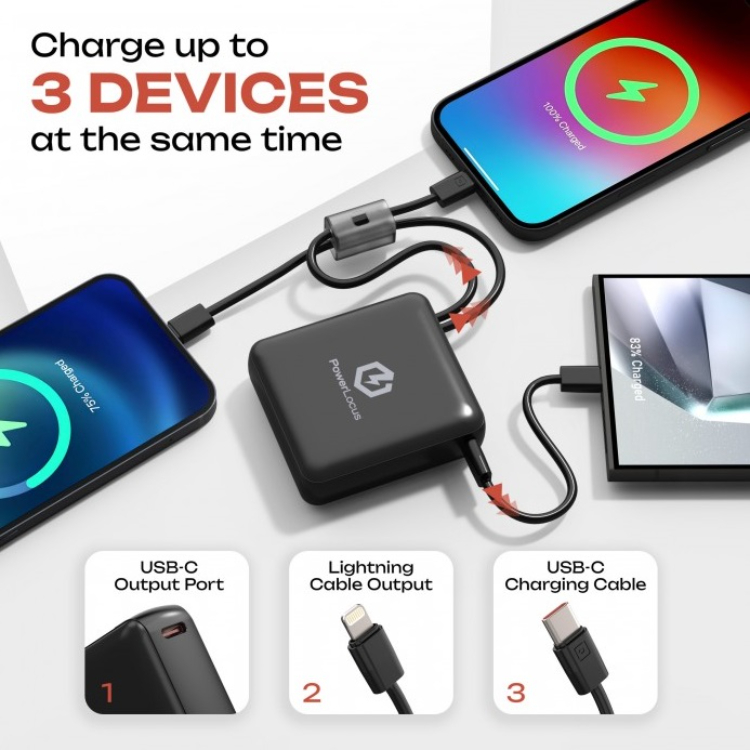 Der externe Akku 10000 mAh, 20 W PD-Schnellladung von PowerLocus, lädt Ihre Geräte schnell und effizient. Machen Sie sich keine Sorgen über ein vergessenes Kabel, der Akku ist mit 2 integrierten Kabeln ausgestattet, die immer zum Laden verfügbar sind, egal wo Sie sind. Dank der 3 Ausgänge können Sie bis zu 3 Geräte gleichzeitig laden.