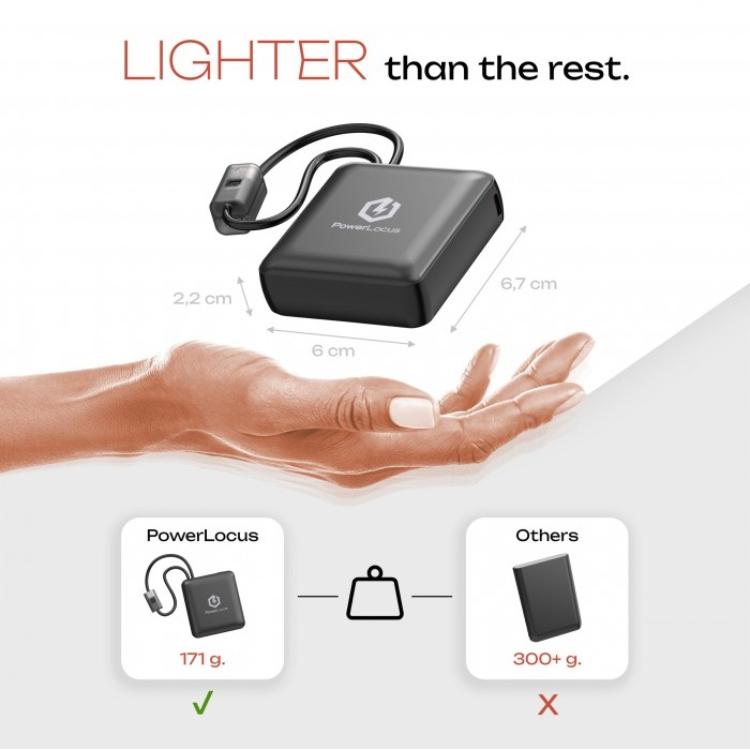 Im Gegensatz zu anderen externen Akkus, die über 300 Gramm wiegen, ist die PowerLocus Powerbank superleicht und wiegt nur 171 Gramm. Außerdem ist es sehr kompakt und passt in Ihre Tasche, es ist sogar kleiner als ein Smartphone und eignet sich daher hervorragend für Reisen!
