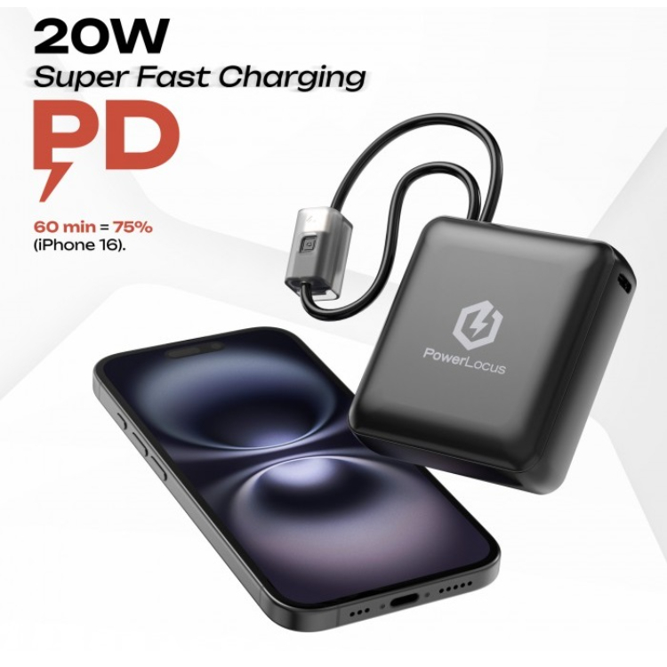 PowerLocus Externer Akku 10000 mAh, 20 W PD-Schnellladung, integrierte Typ-C- und Lightning-Kabel, Schwarz