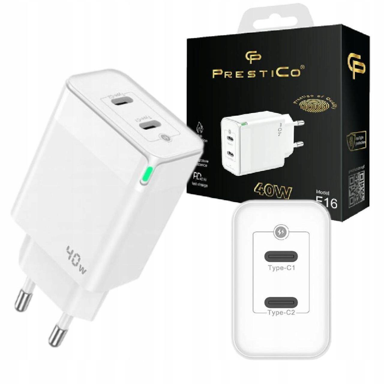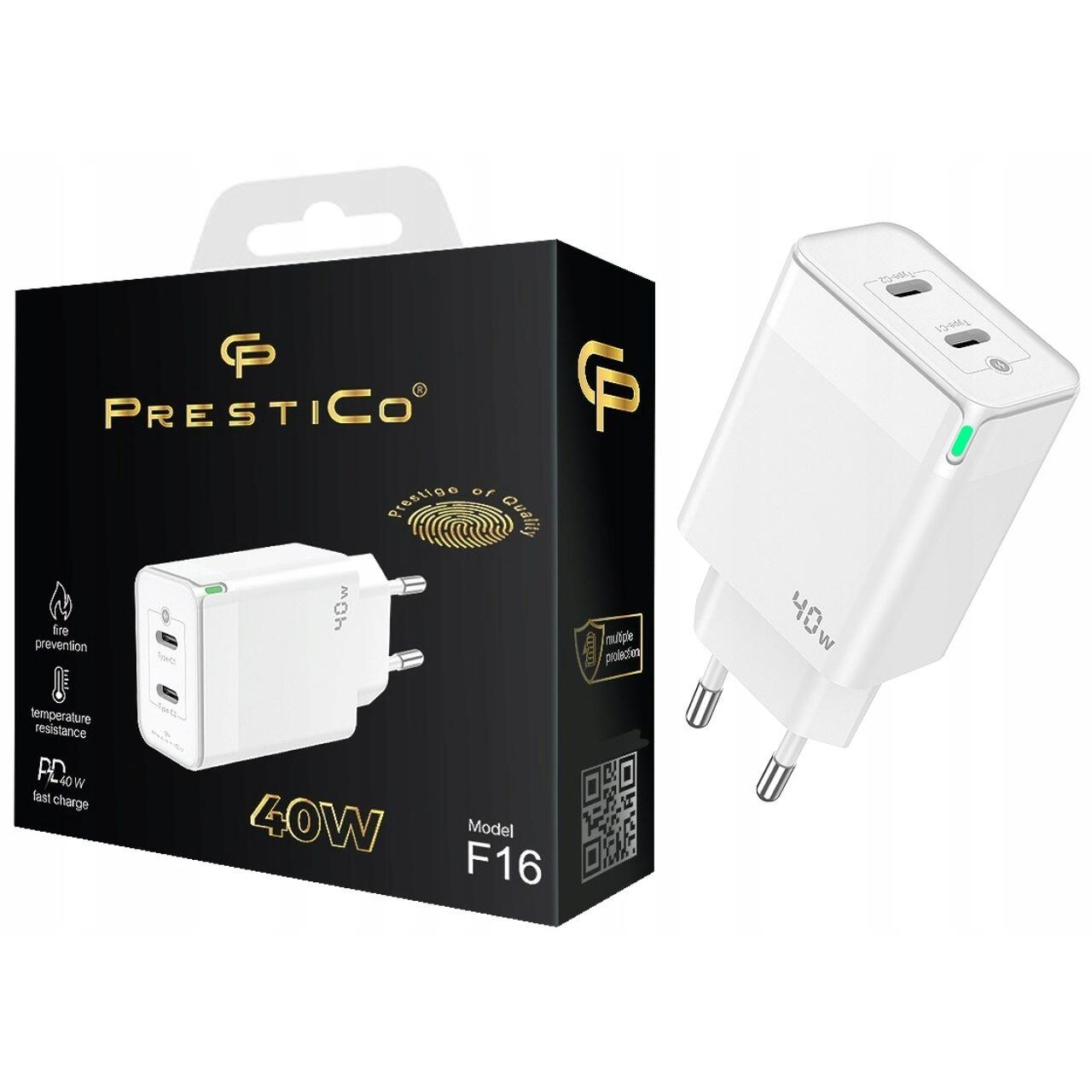 Le Chargeur Réseau Prestico F16 2 x USB-C, PD, Charge Rapide, 40W Blanc, s''adapte à tous types d''intérieurs, et la qualité de fabrication indique qu''il s''agit d''un appareil solide et durable.