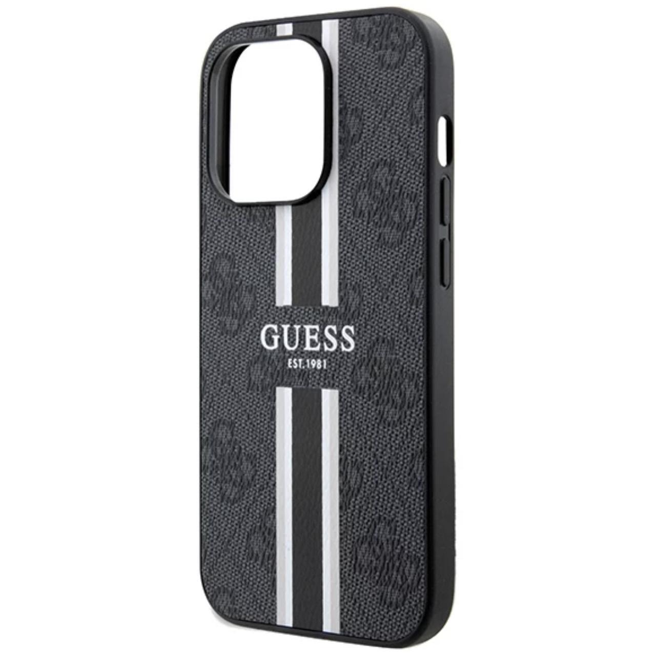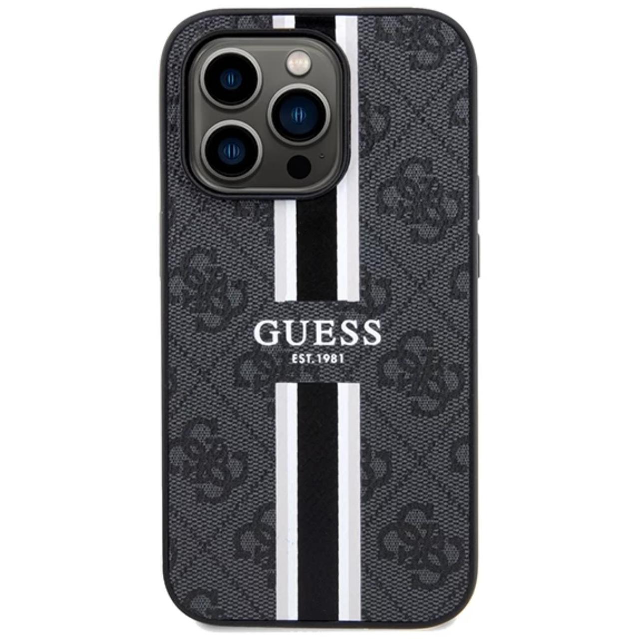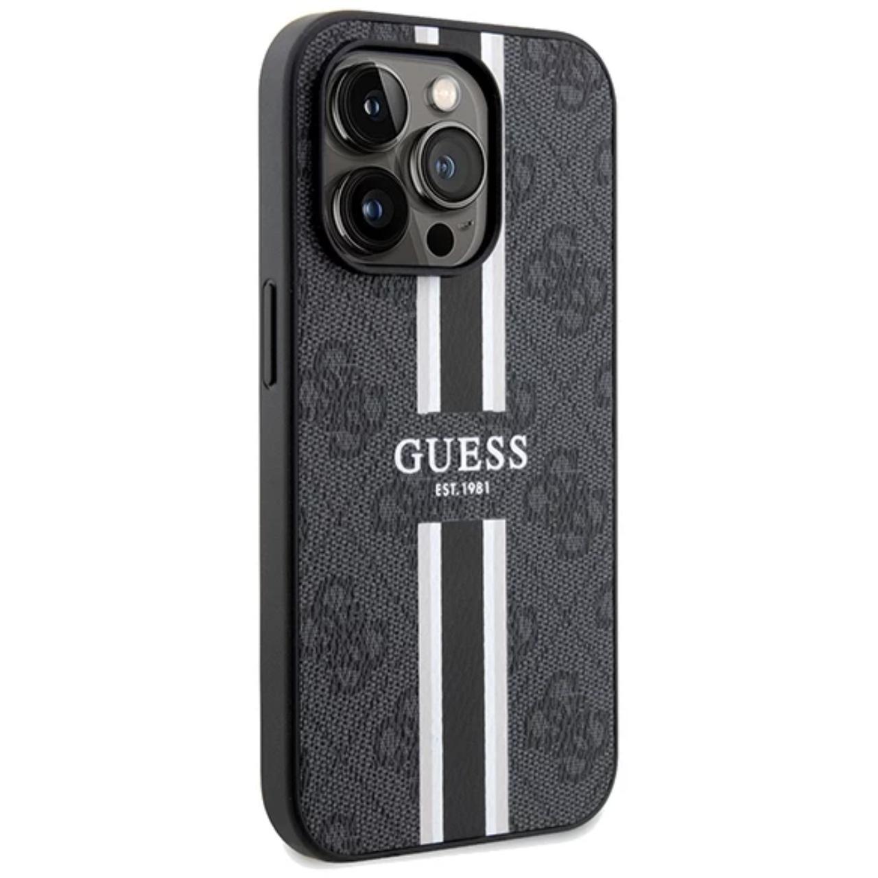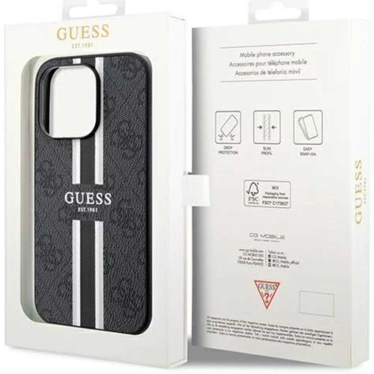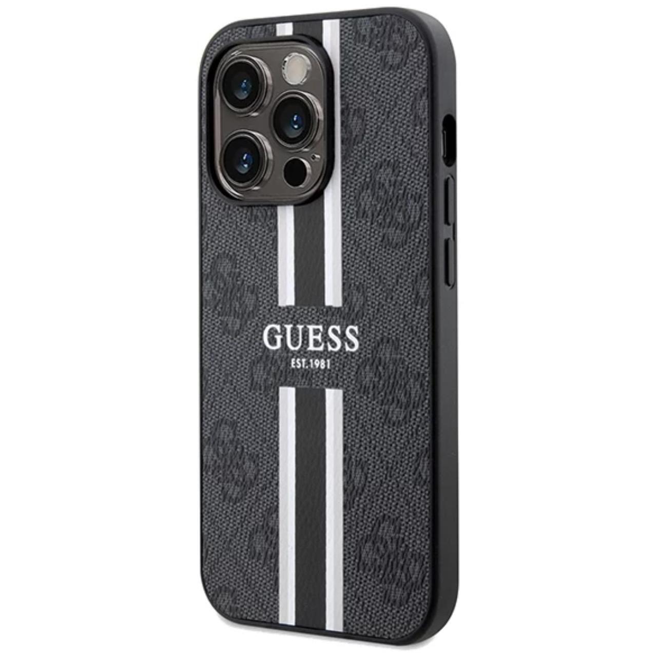 Coque Guess 4G Rayures Imprimées MagSafe pour iPhone 15 Pro, est fabriqué dans un matériau agréable au toucher qui protège votre téléphone des légers chocs ou rayures.