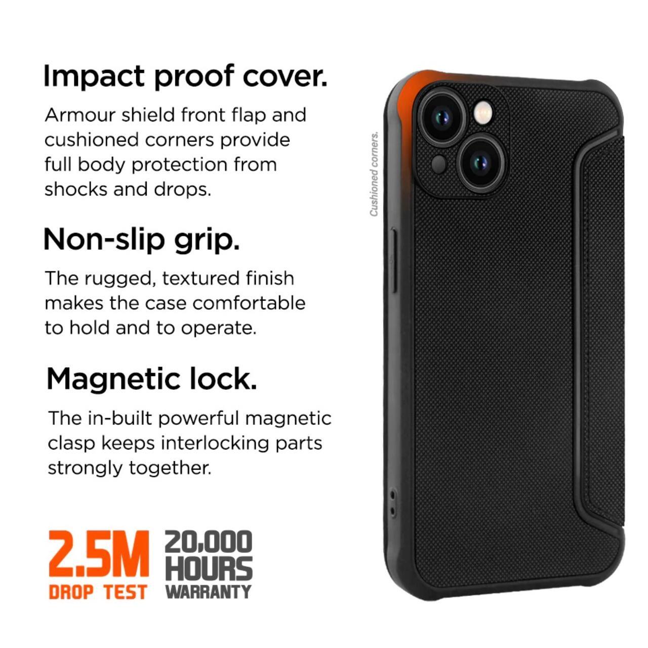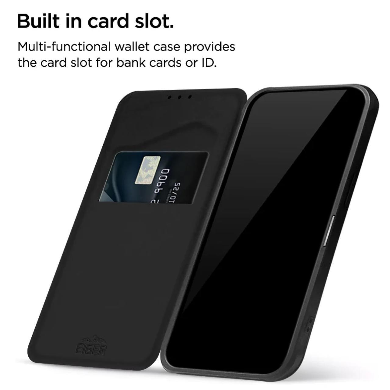 North Folio Case iPhone 14 Plus Noir de la marque Eiger, cet étui à rabat donne à votre téléphone un look unique et élégant, tout en offrant une protection contre les rayures, les chocs et la poussière.
