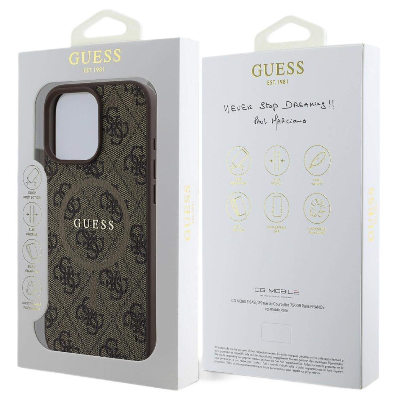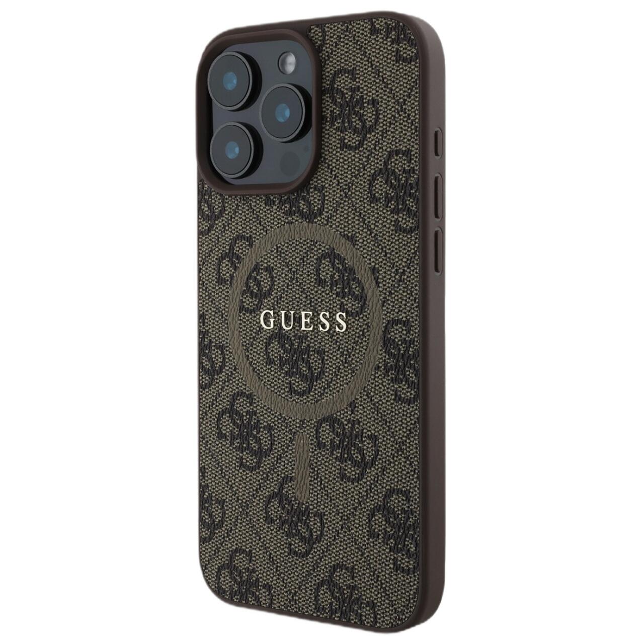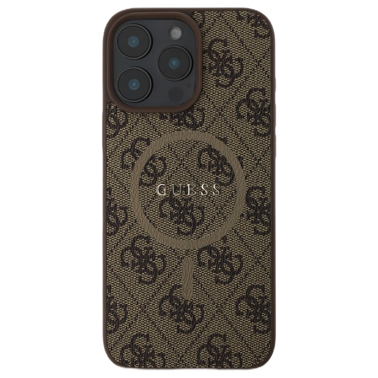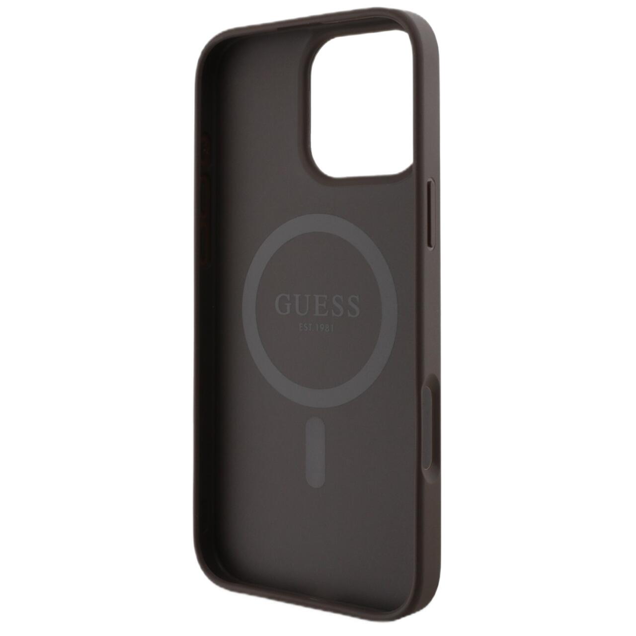 Coque Guess en cuir PU 4G avec anneau coloré MagSafe pour iPhone 16 Pro Max. Son design innovant en polyuréthane durable garantit une résistance à l'usure quotidienne. Les bords extérieurs légèrement surélevés protègent l'écran du téléphone des dommages, tandis que ceux autour de l'objectif de l'appareil photo protègent l'optique des rayures.