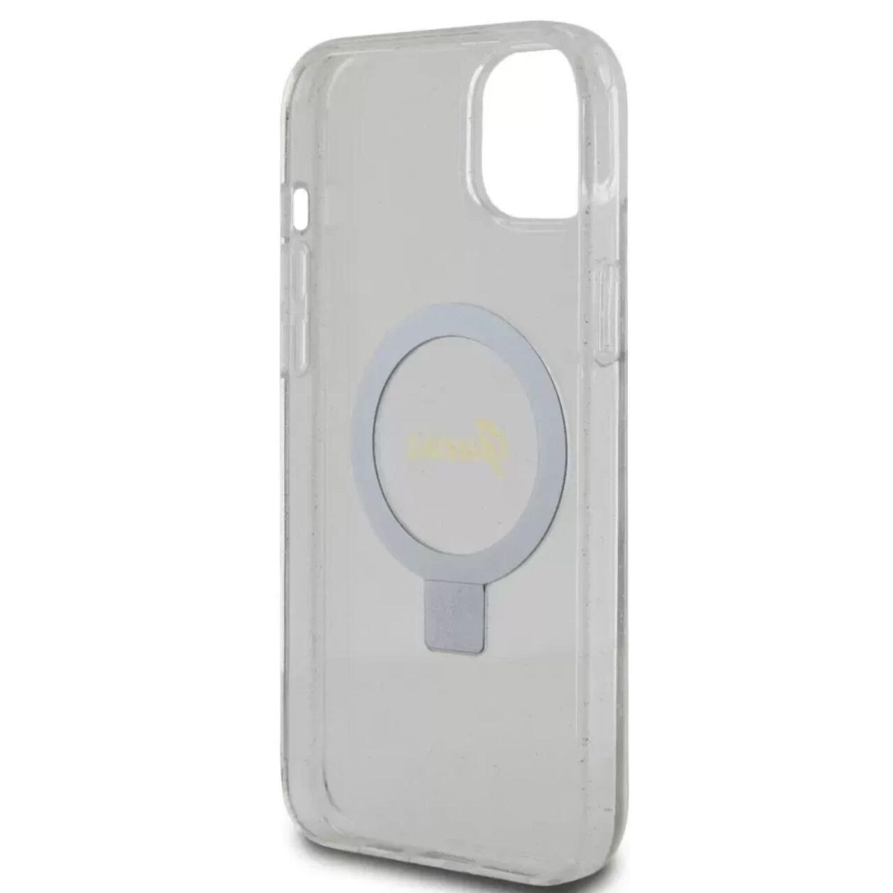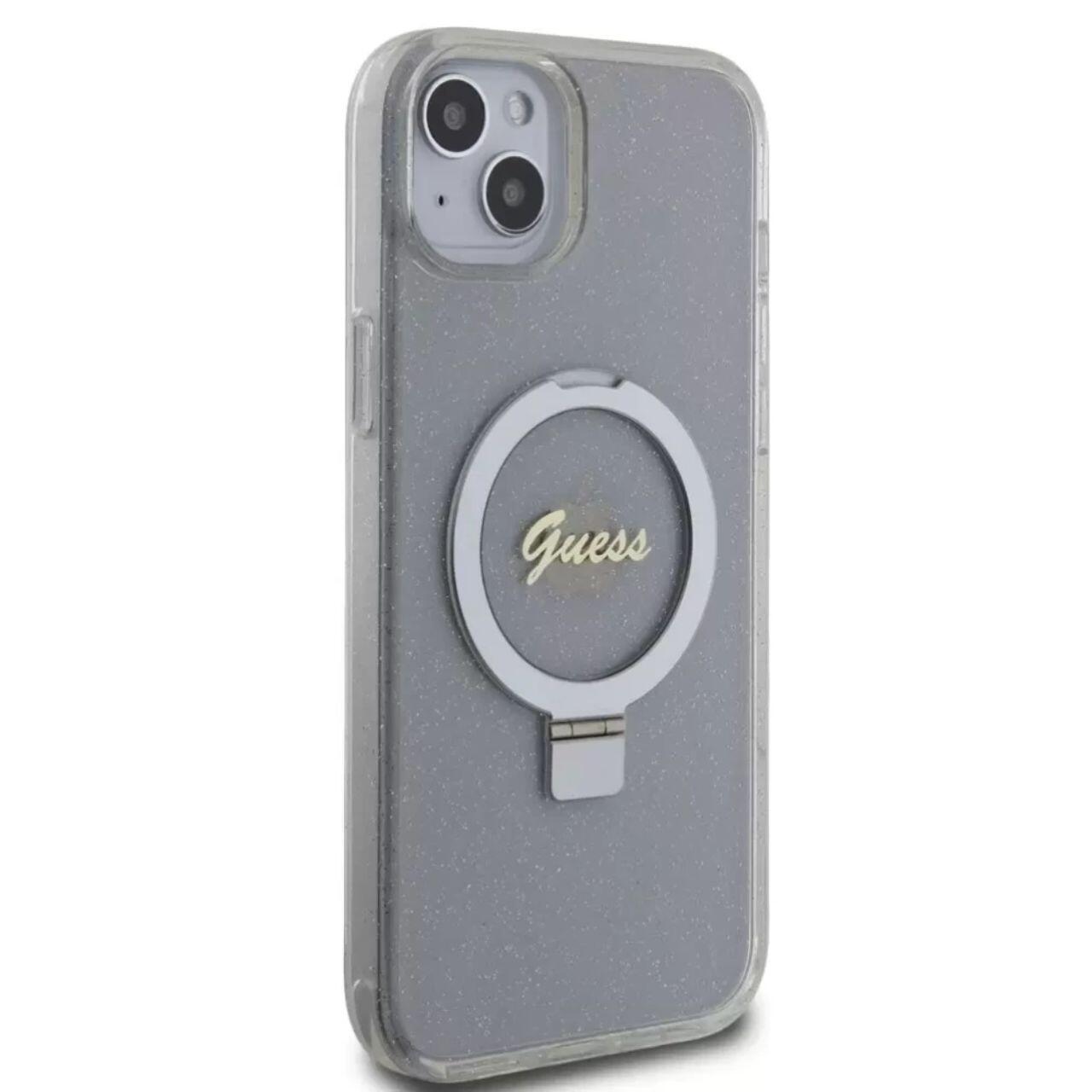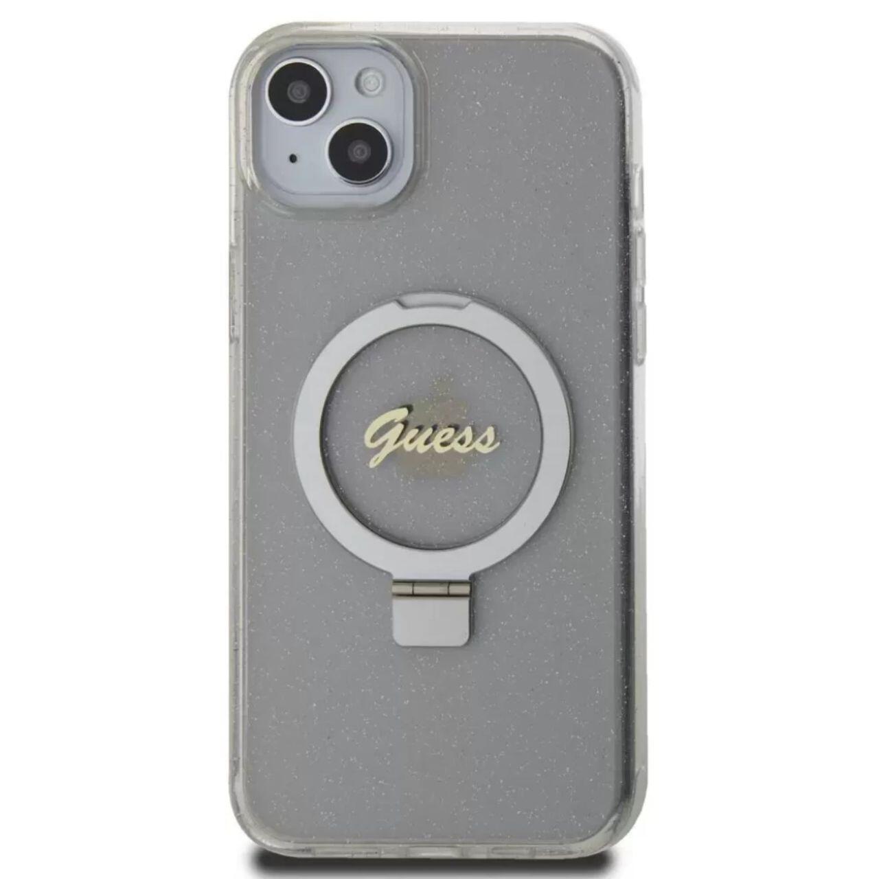 Guess Husa Ring Stand Glitter MagSafe iPhone 15 Plus Transparent
