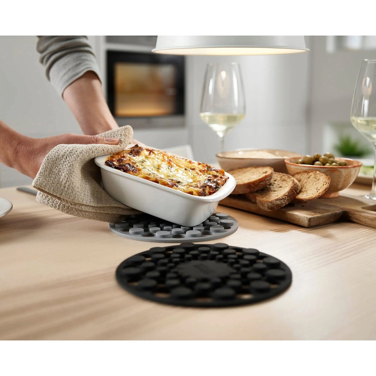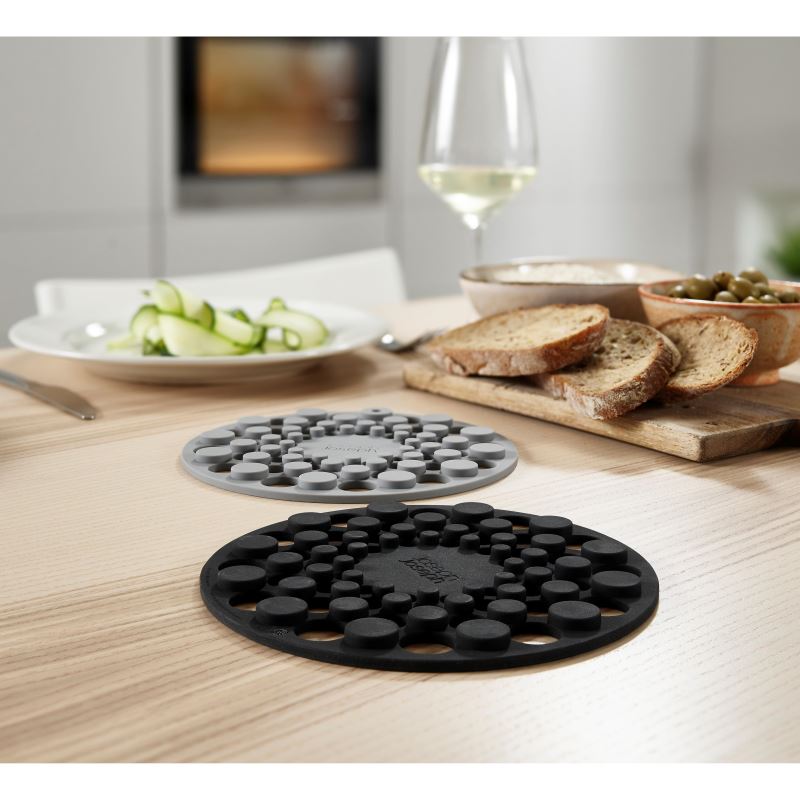 Ces deux tampons circulaires sont résistants à la chaleur jusqu'à 220˚C (428˚F), protègent les surfaces des rayures et des dommages causés par la chaleur, sont résistants à la saleté et parfaits pour un stockage compact.