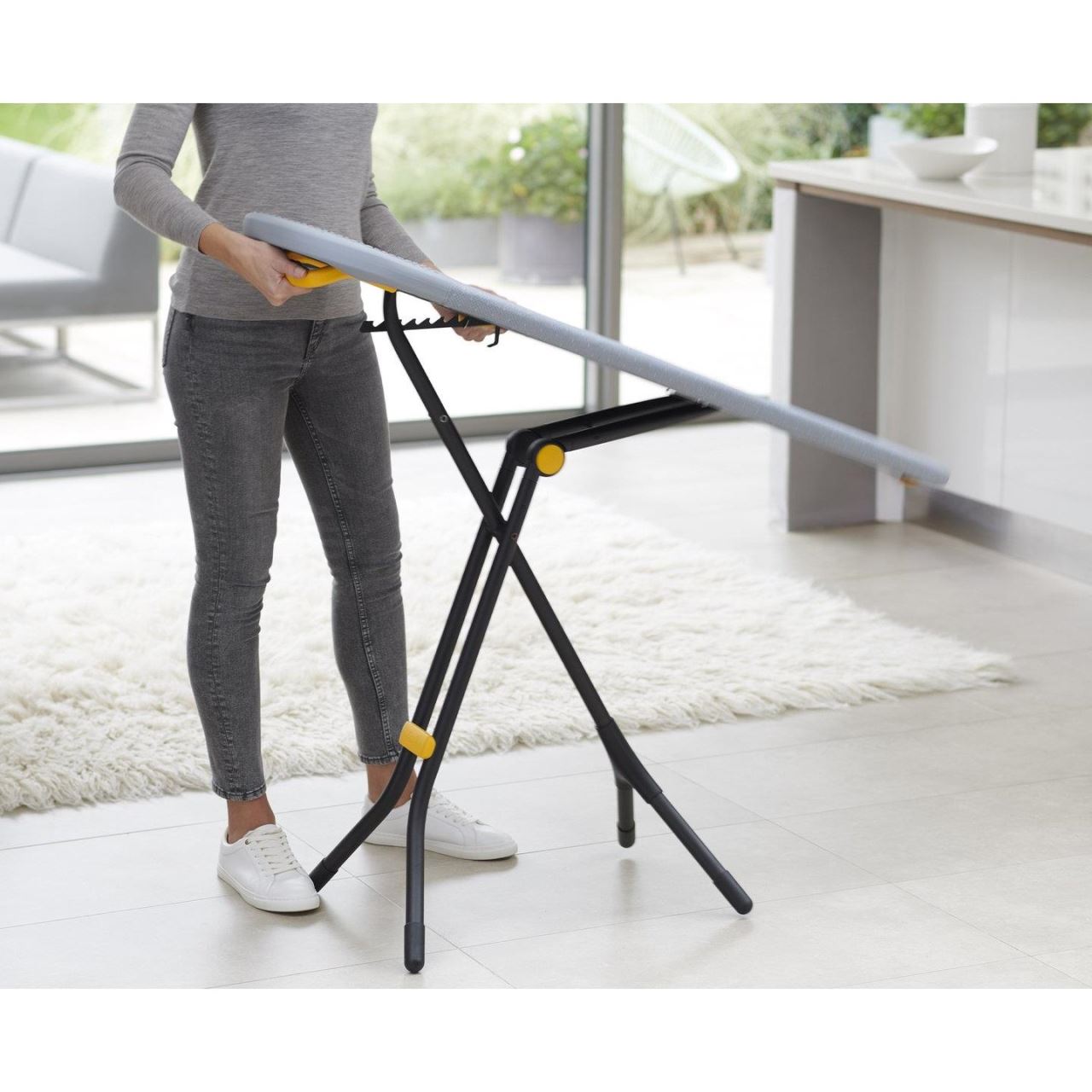 Cette planche à repasser révolutionnaire de grande taille a une conception de support unique qui la rend plus compacte lorsqu'elle est rangée que les autres planches à repasser conventionnelles.