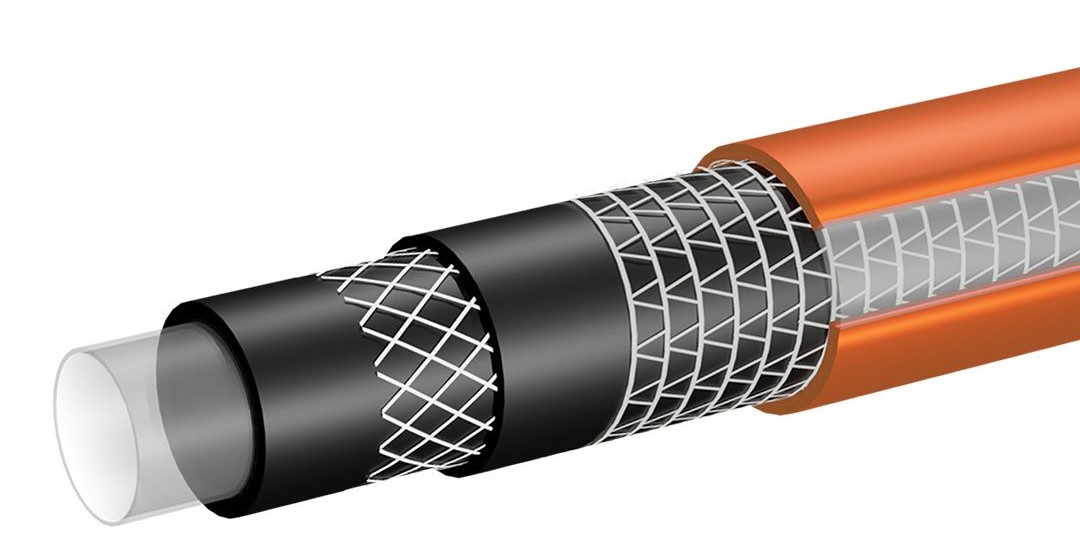 The 6-layer garden hose is made of flexible PVC, reinforced with polyester threads, with two braids (cross and tricot).