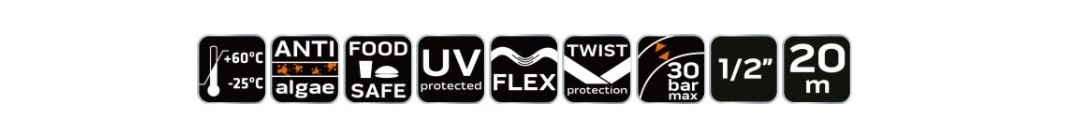 The hose is resistant to the deposition of algae and UV rays, being also suitable for contact with food thanks to the Food Safe layer.