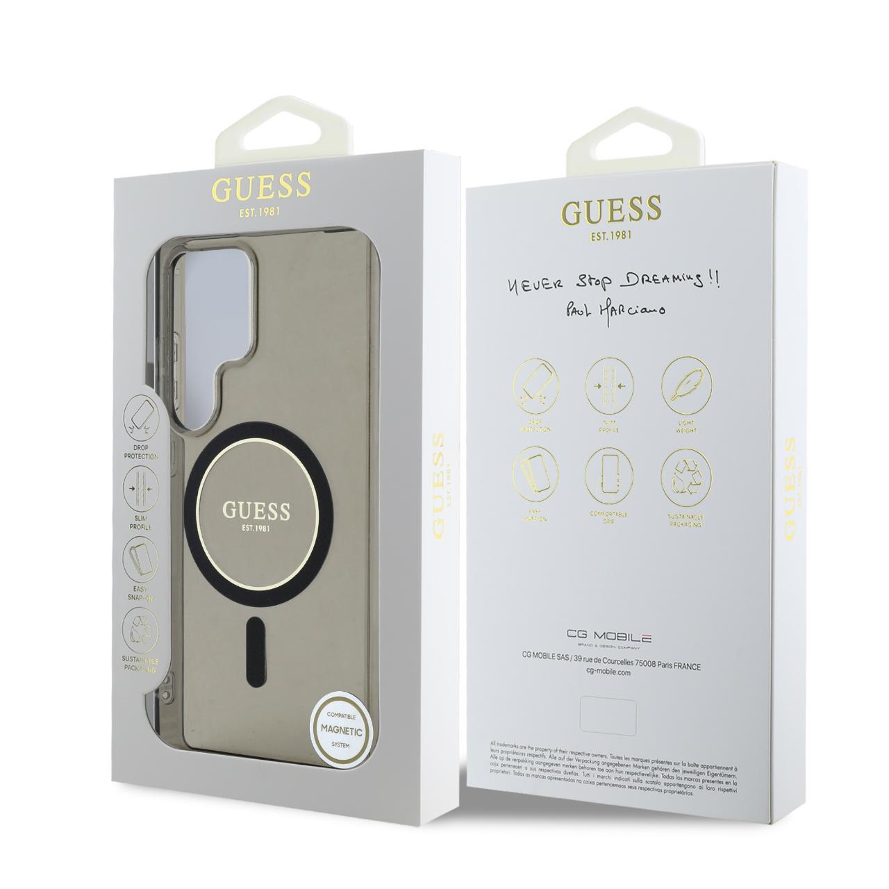 Glitter Circle Classic Logo MagSafe Case for Samsung Galaxy S25 Ultra from Guess made of hard polycarbonate and flexible TPU, which guarantees a durable structure and excellent protection against scratches and falls. The flexible sides make fitting and removing the case quick and easy, and the raised edges protect both the screen and the camera.