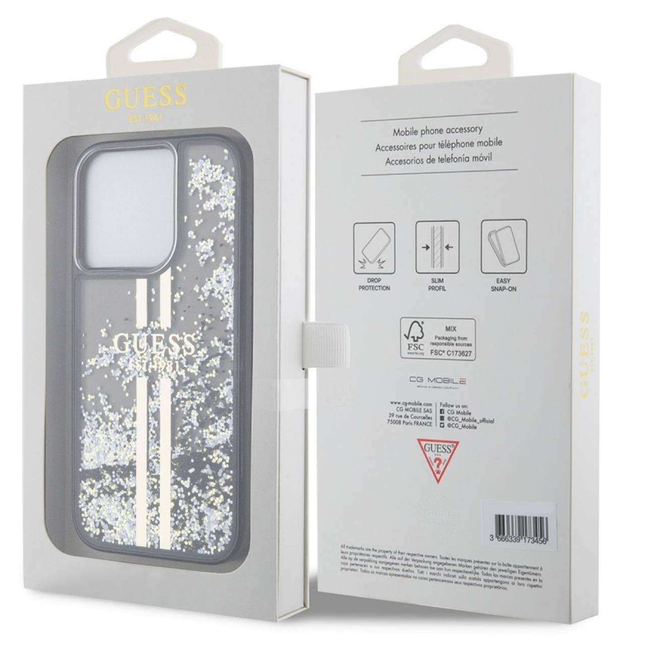 The Liquid Glitter Gold Stripe case from Guess for iPhone 15 Pro Max, is made of soft and durable material with attractive glitter inside that adds a big plus to your outfit, the case protects the phone on the side and back against dust and scratches.