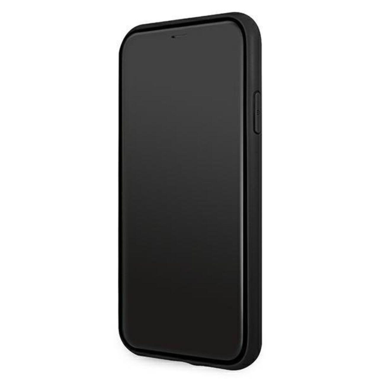 PU Case 4G Metal Logo for iPhone 11 from Guess is made of plastic with soft gel edges and the back covered with textile material with a special design and the metallic GUESS logo.