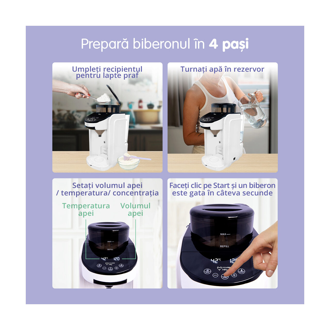 Attention! It is very important to choose the correct setting depending on the brand and type of milk powder you use! Some powders, especially hypoallergenic ones, can dissolve more easily and it will be necessary to shake the bottle according to the instructions on the formula box. Read all instructions carefully before use! ATTENTION! Once unsealed, the product cannot be returned. This product is exempt from returns, according to GEO 34/2014 on consumer rights. ART. 16