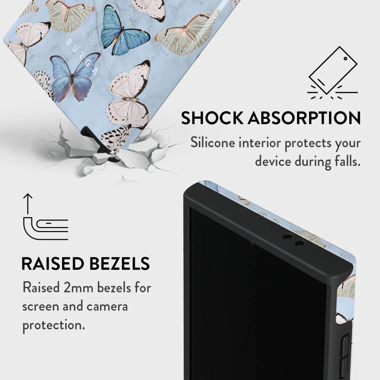 doppio strato dammi farfalle Samsung Galaxy S24 Ultra de Burga, ha un motivo unico e colorato e l'interno del silicone proteggerà il tuo dispositivo durante le cadute mentre i telai alti 2 mm offrono protezione da schermo e fotocamera.