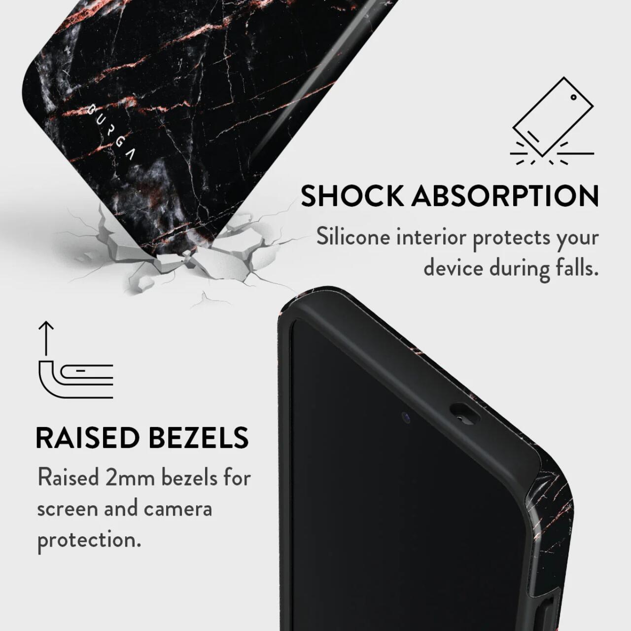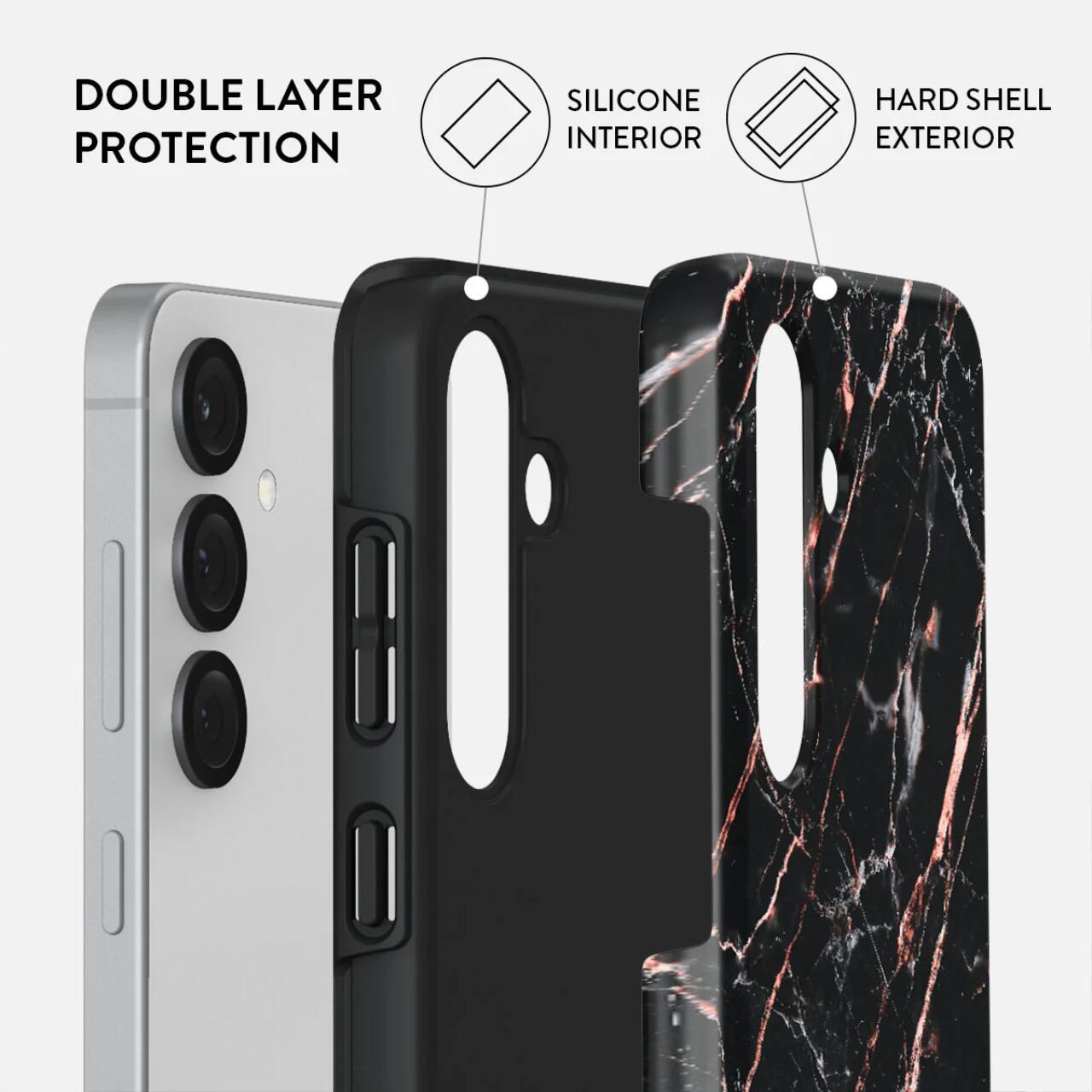 La custodia Burga Dual Layer Rose Gold Marble per Samsung Galaxy S25, ha un motivo unico e colorato, e l'interno in silicone proteggerà il dispositivo in caso di caduta, mentre le cornici rialzate da 2 mm offrono protezione per lo schermo e la fotocamera.