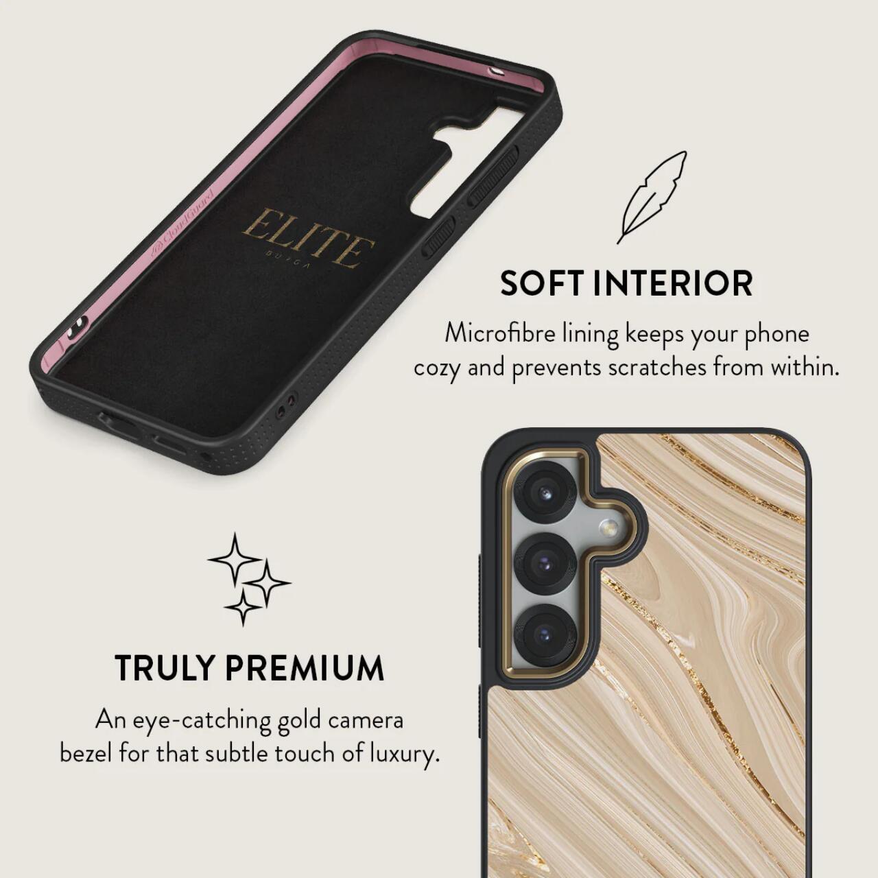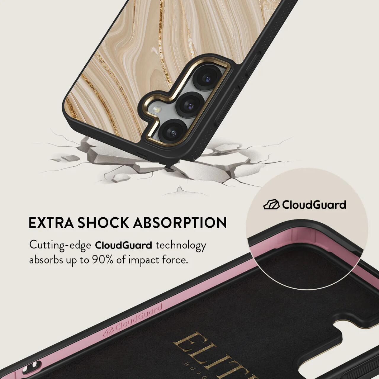 La custodia Elite Gold Full Glam per Samsung Galaxy S25 di Burga, è dotata della tecnologia CloudGuard che offre protezione contro i danni, essendo progettata per assorbire gli urti e difendersi. Mentre il suo esterno rigido protegge da graffi e cadute, lo strato interno in silicone TPU ammortizza delicatamente il telefono assorbendo fino al 90% dell'impatto.
