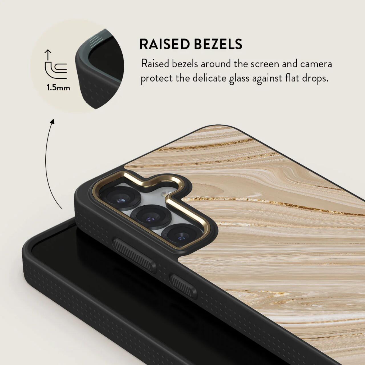 La custodia presenta cornici rialzate di 1,5 mm attorno allo schermo e alla fotocamera per proteggere il delicato vetro dalle cadute e, grazie al nostro design protettivo sottile, lo schermo e l'obiettivo della fotocamera non toccheranno mai superfici piane.