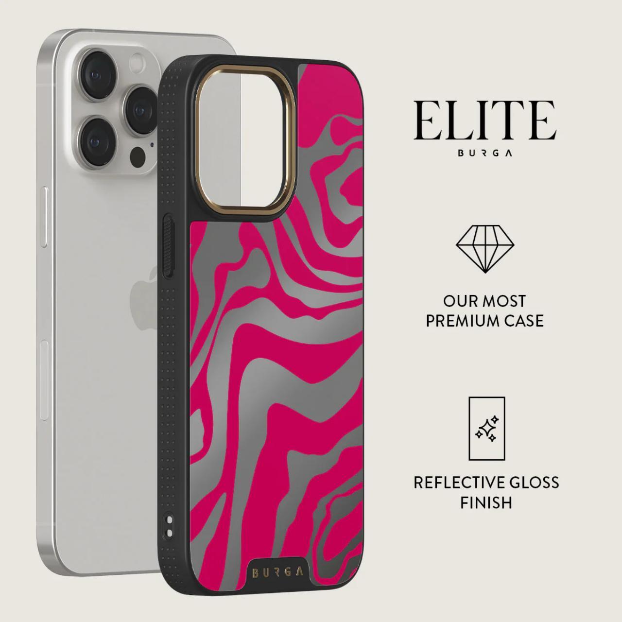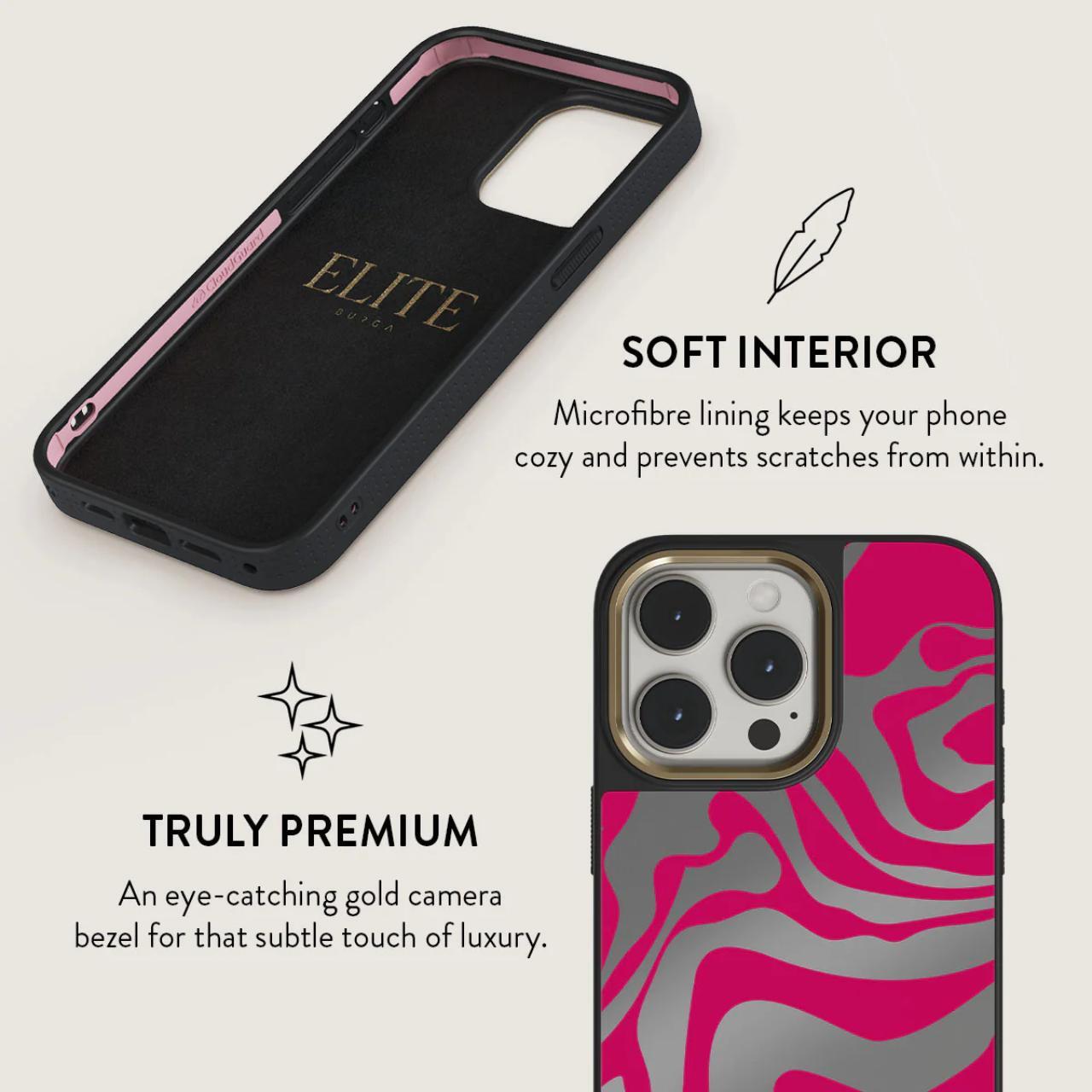 Custodia Burga Elite Mirror Magsafe Gold Siren per iPhone 15 Pro, progettata per assorbire gli urti e proteggere, è dotata della più recente tecnologia CloudGuard e di un'elegante finitura a specchio. L'interno in microfibra mantiene il telefono comodo e previene i graffi.