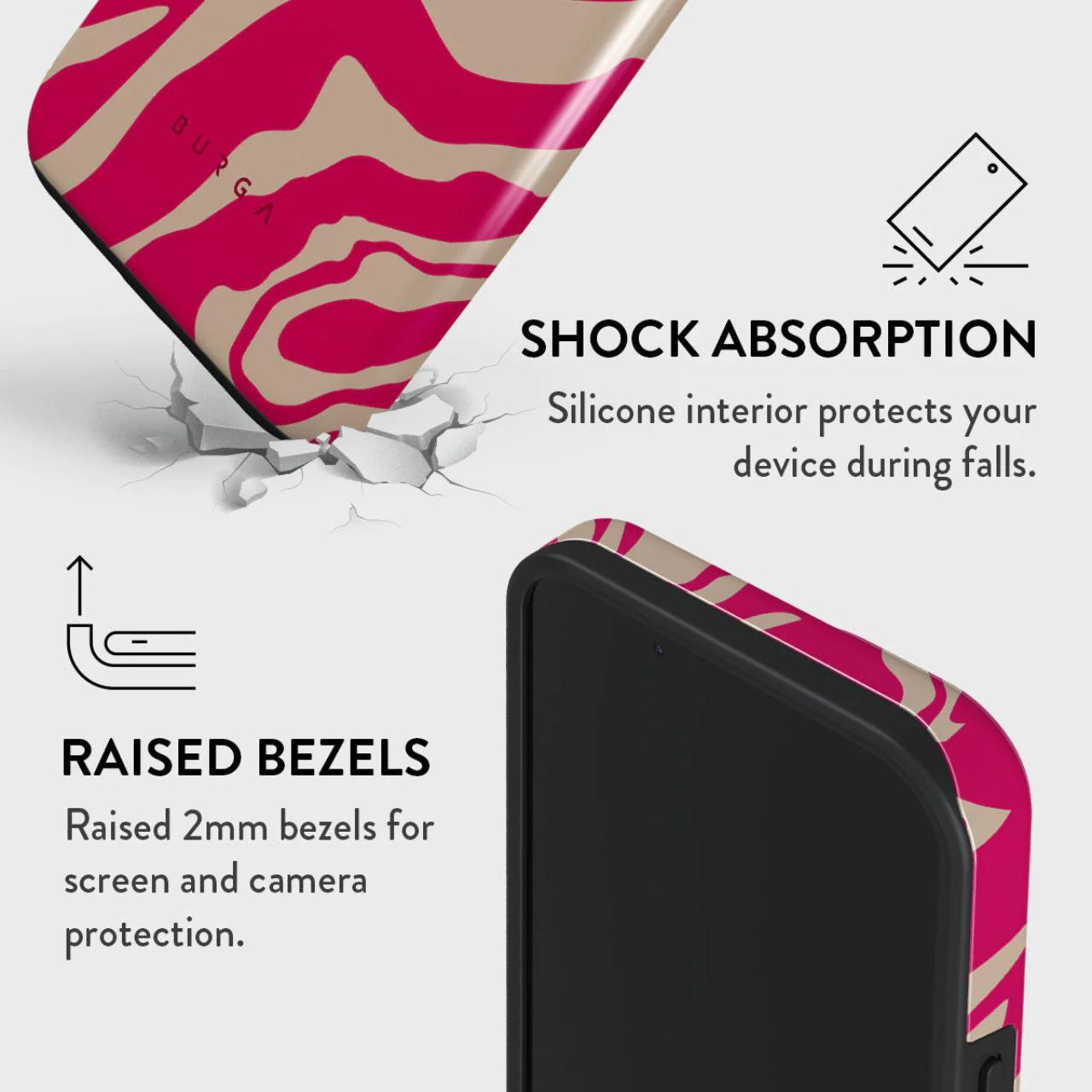 La custodia Burga Dual Layer Siren, compatibile con iPhone 15, è realizzata con materiali di qualità che prevengono l''usura del telefono.
