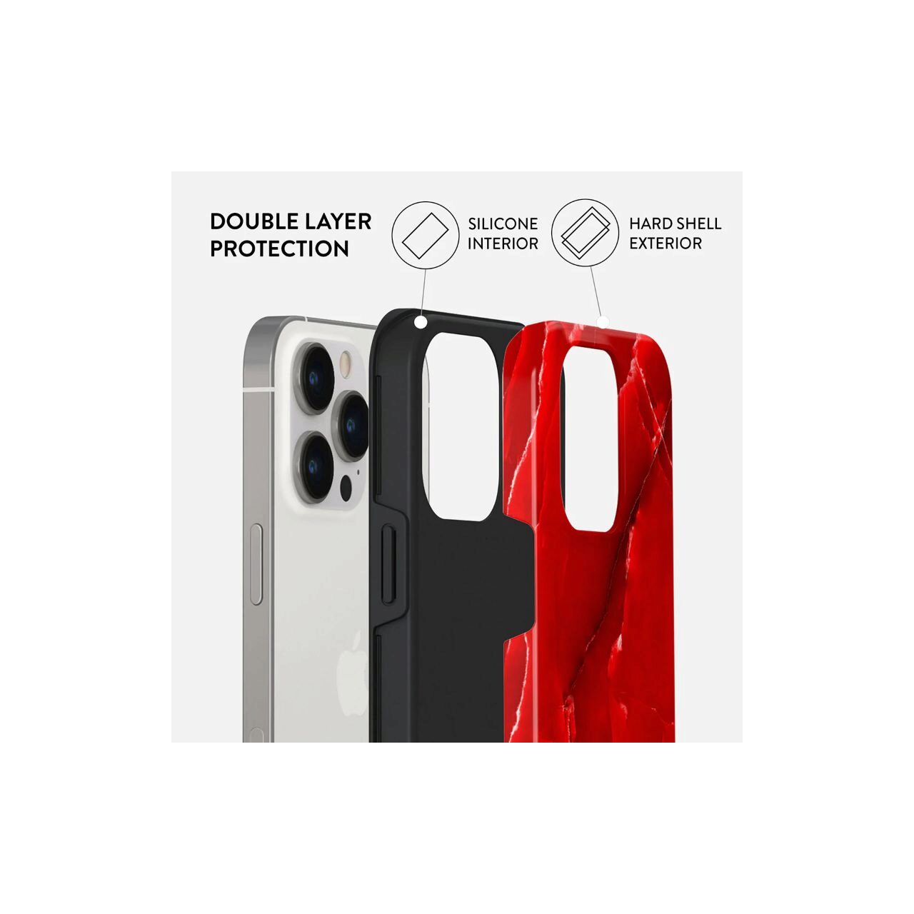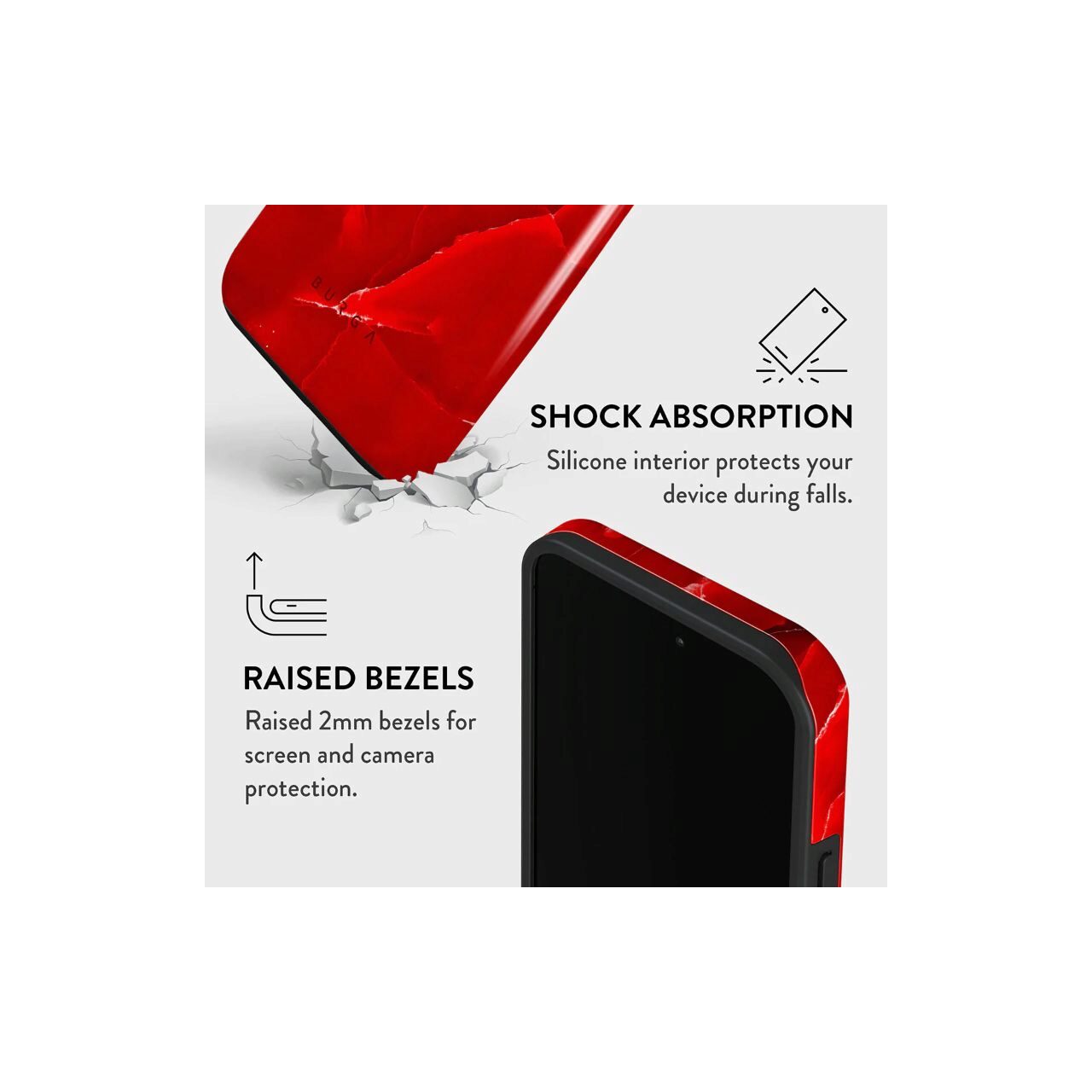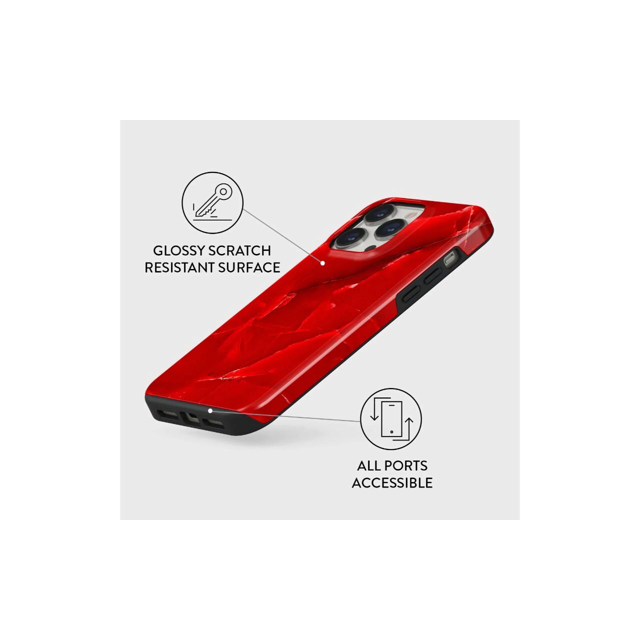 Custodia Wild Blaze doppio strato per iPhone 14 Pro Max di Burga ha un design sorprendente di marmo rosso brillante, che aggiungerà sicuramente inversione e un tocco di colore al tuo amato dispositivo, e l'interno in silicone proteggerà il dispositivo durante le cadute mentre i telai 2 mm di altezza offre protezione per lo schermo e la fotocamera.