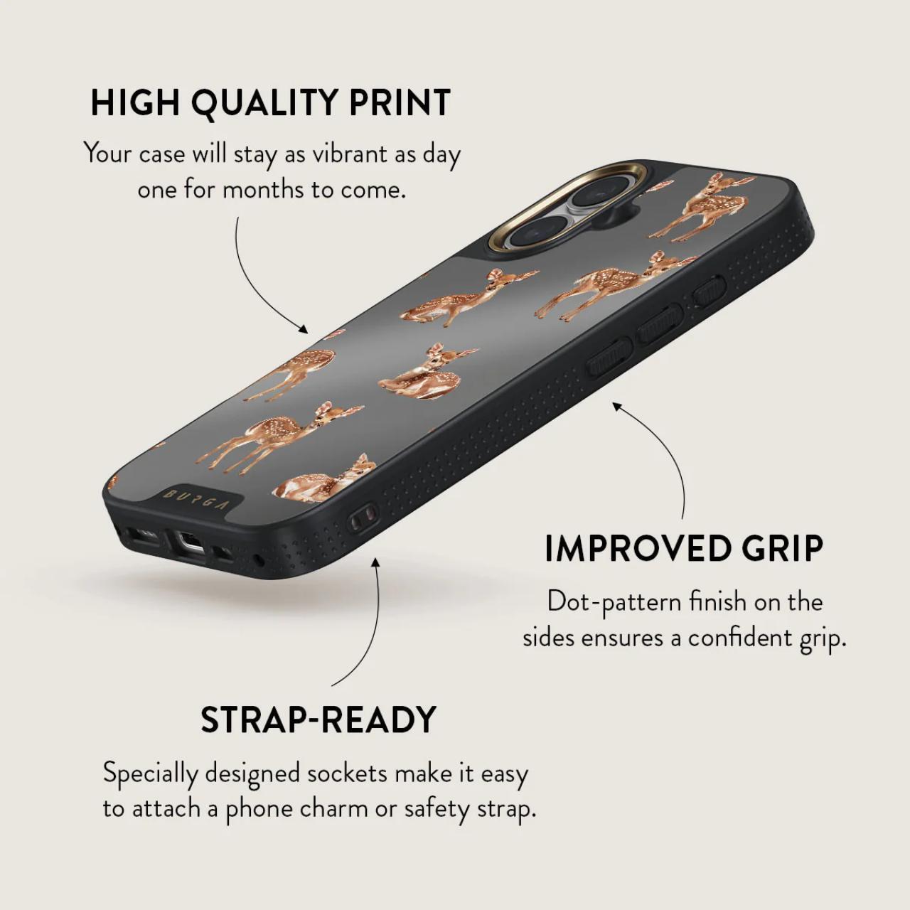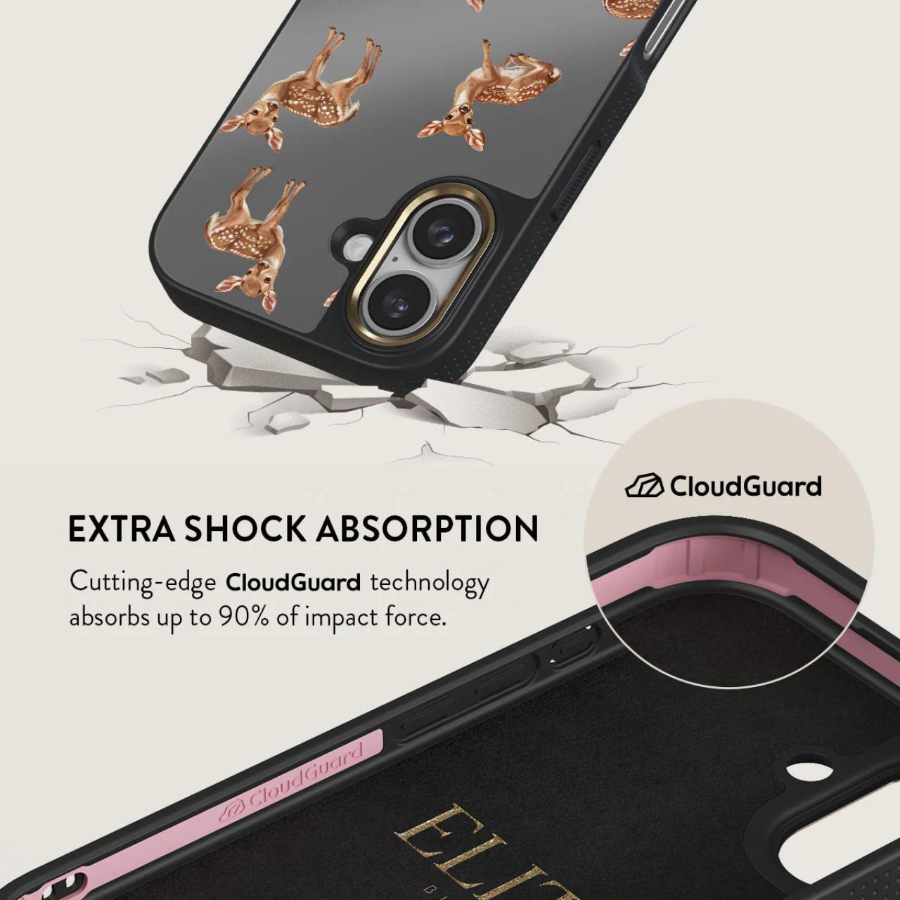 Custodia Burga Elite Mirror Magsafe Gold Bambi per iPhone 16, progettata per assorbire gli urti e proteggere, è dotata della più recente tecnologia CloudGuard e di un'elegante finitura a specchio. L'interno in microfibra mantiene il telefono comodo e previene i graffi.