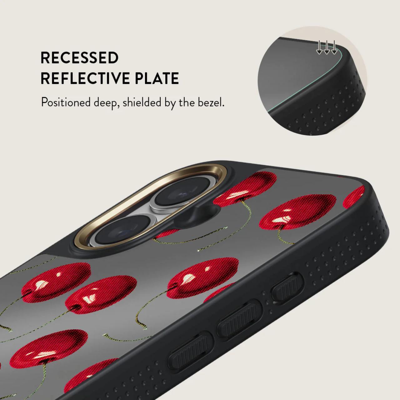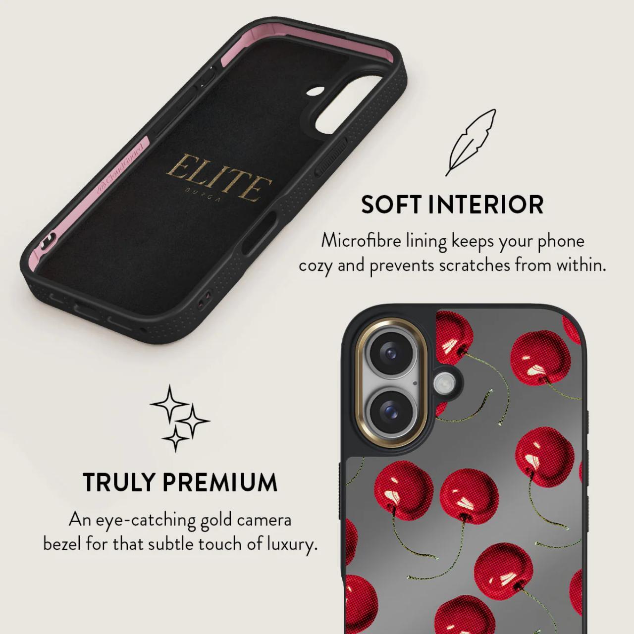 Custodia Burga Elite Mirror Magsafe Gold Cherrybomb per iPhone 16 progettata per assorbire gli urti e proteggere, è dotata della più recente tecnologia CloudGuard e di un'elegante finitura a specchio. L'interno in microfibra mantiene il telefono comodo e previene i graffi.