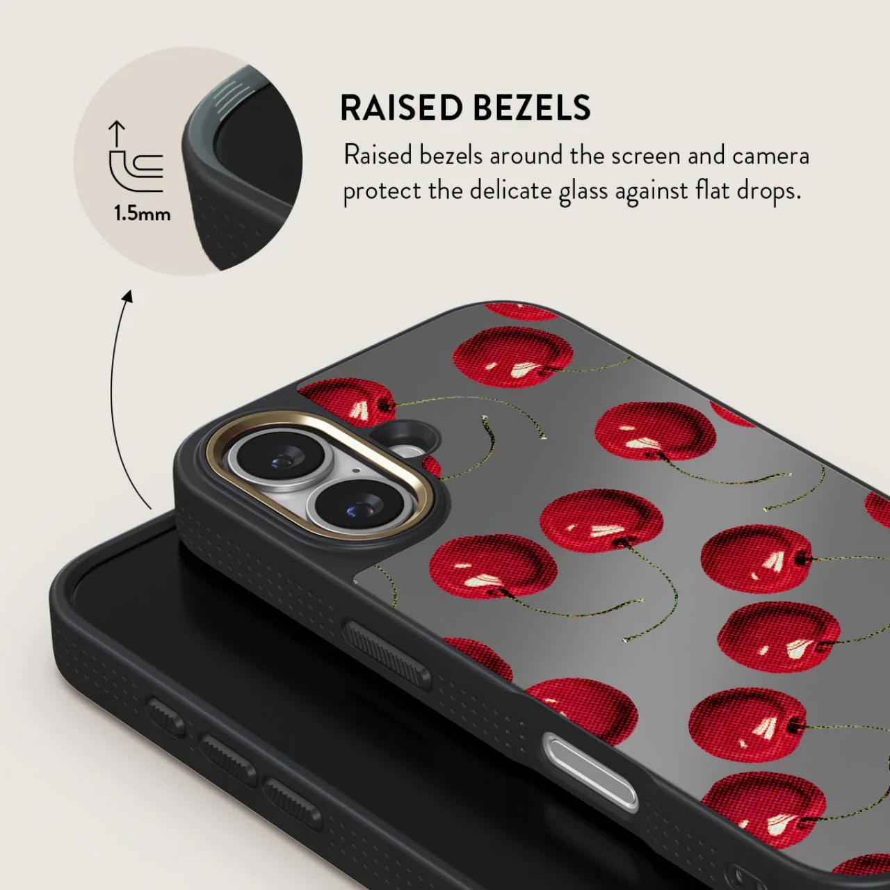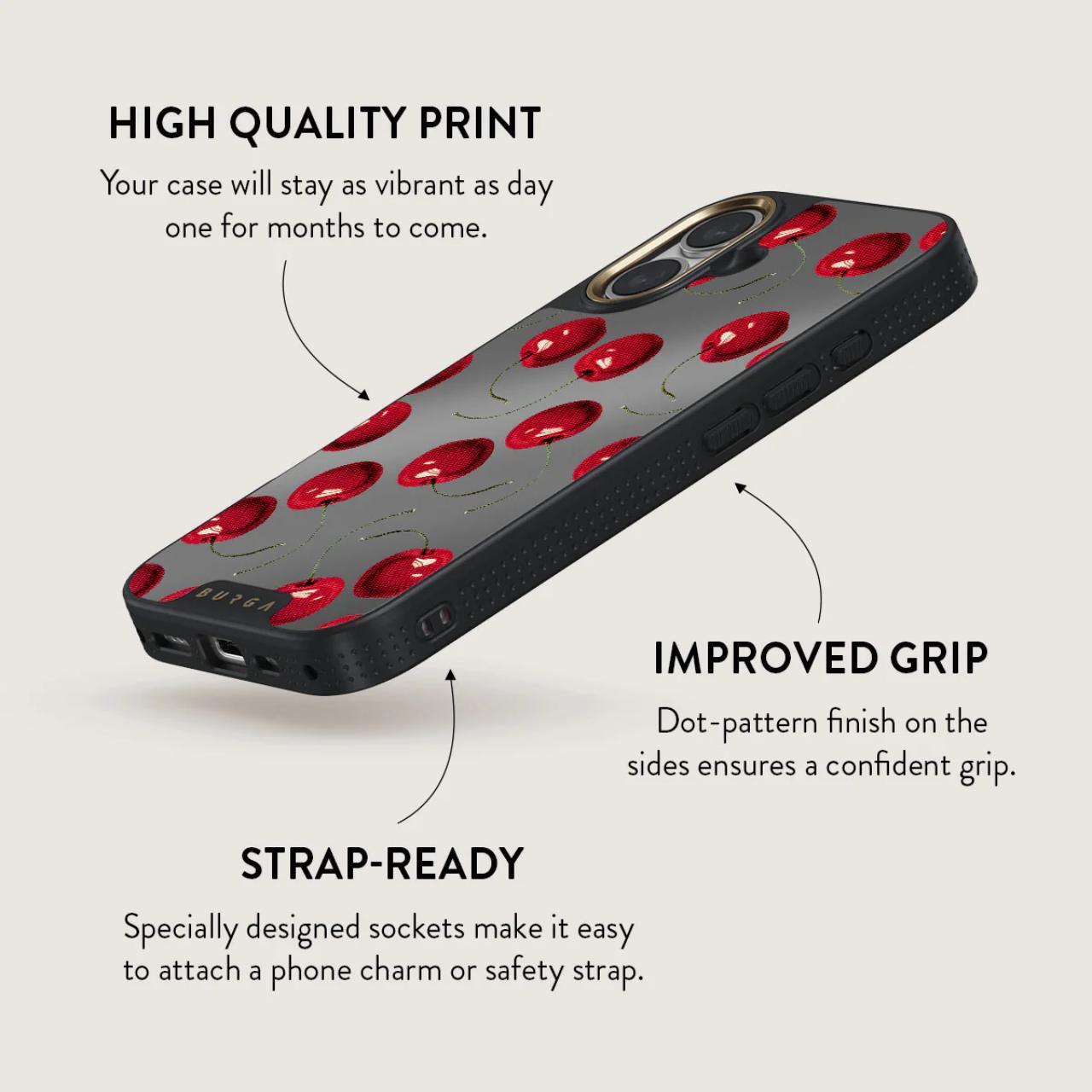Cherrybomb - su uno sfondo nero intenso, risaltano le intense ciliegie rosse. Allettante e audace, il design della nostra custodia per iPhone 16 è perfetto per chi ama mantenere le cose semplici ma d'effetto.