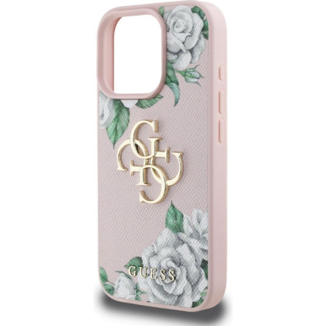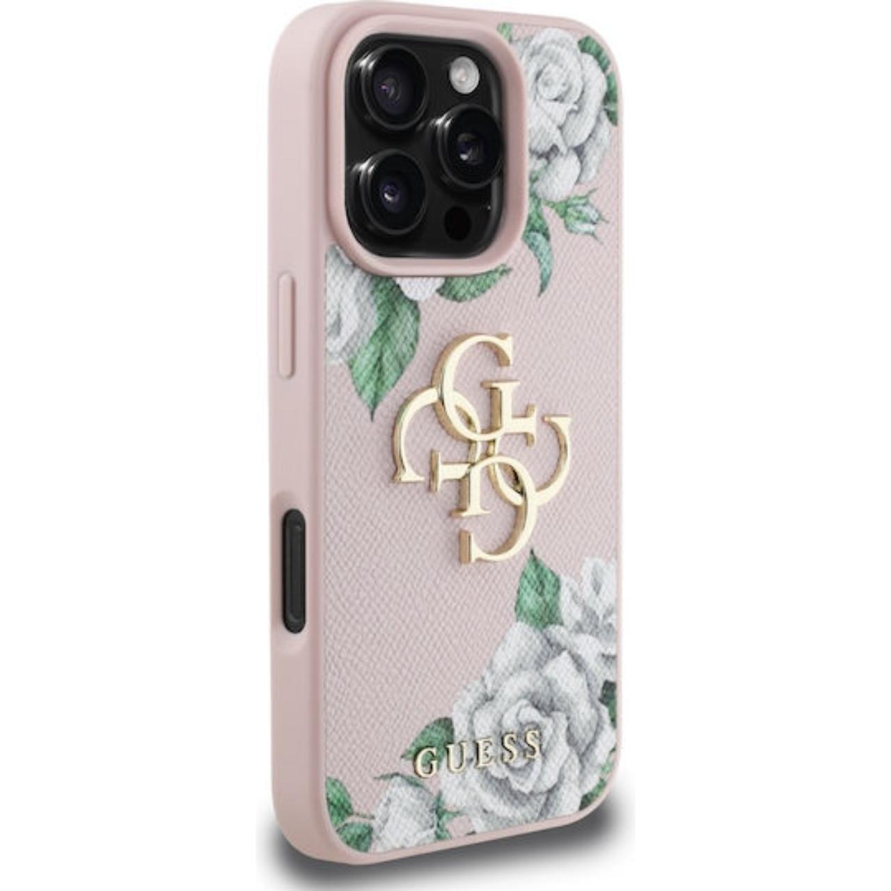 Custodia Guess Grained Roses 4G Metal Logo per iPhone 16 Pro Rosa